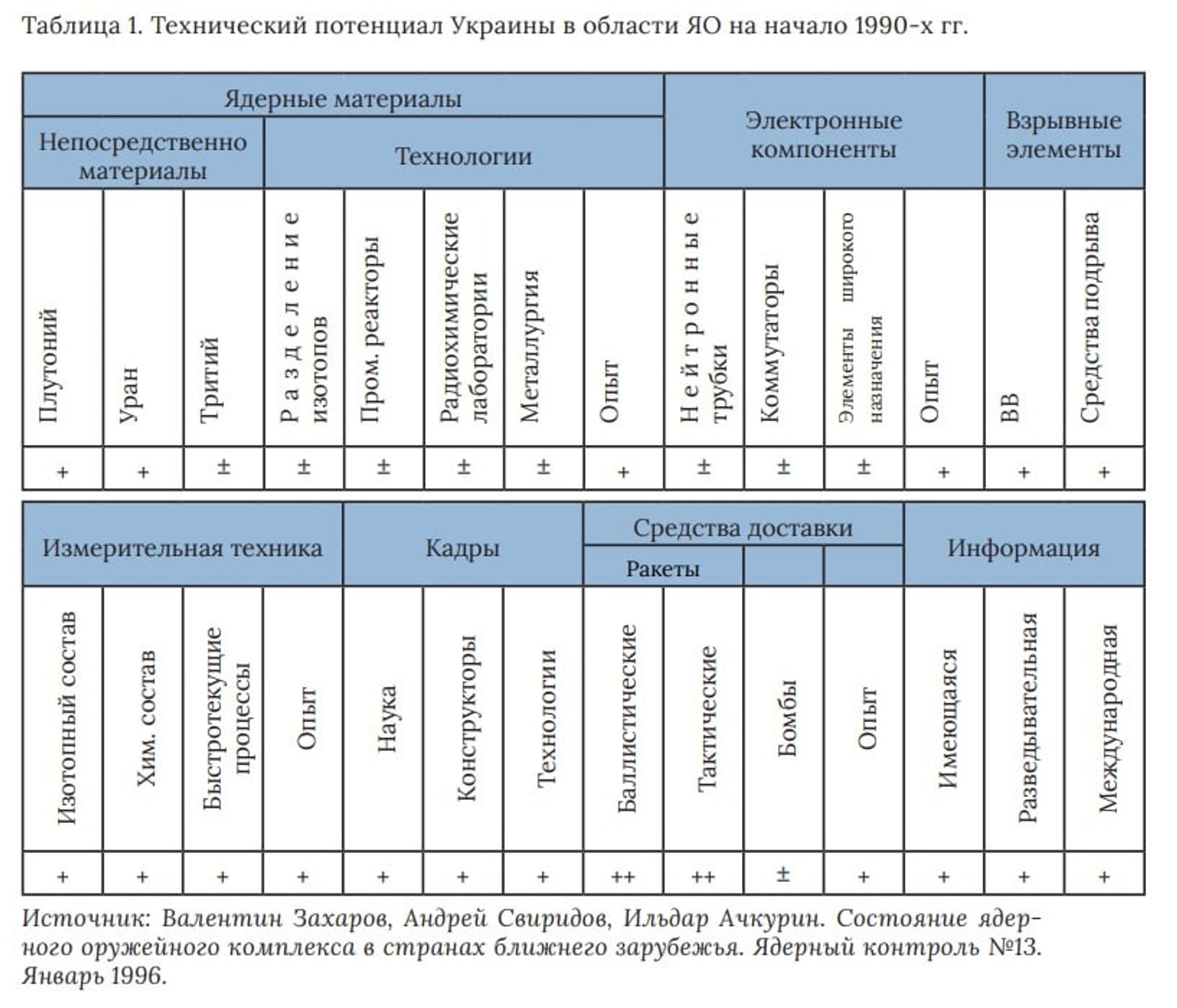 В любом случае в начале 1990-х гг. украинская промышленная и научная база позволяла вести работы по самостоятельному созданию ЯО: по сути, стране не хватало только наработок в области производства расщепляющихся материалов оружейного качества и выпуска ядерных боезарядов.