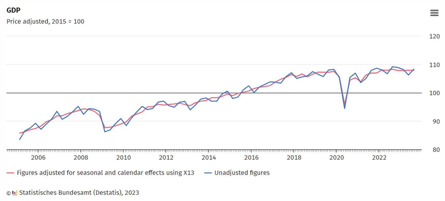 Темпы роста ВВП в ЕС действительно ниже, чем в РФ, в третьем квартале 2023 года они оказались почти нулевыми. Но сравнивать с ними рост российского ВВП не вполне честно: в случае с Россией сказывается эффект низкой базы, так как на конец прошлого года пришлось значительное падение ВВП, вызванное санкциями и уходом западных компаний с российского рынка. Вот для примера графики роста ВВП России и крупнейшей экономики ЕС — Германии.