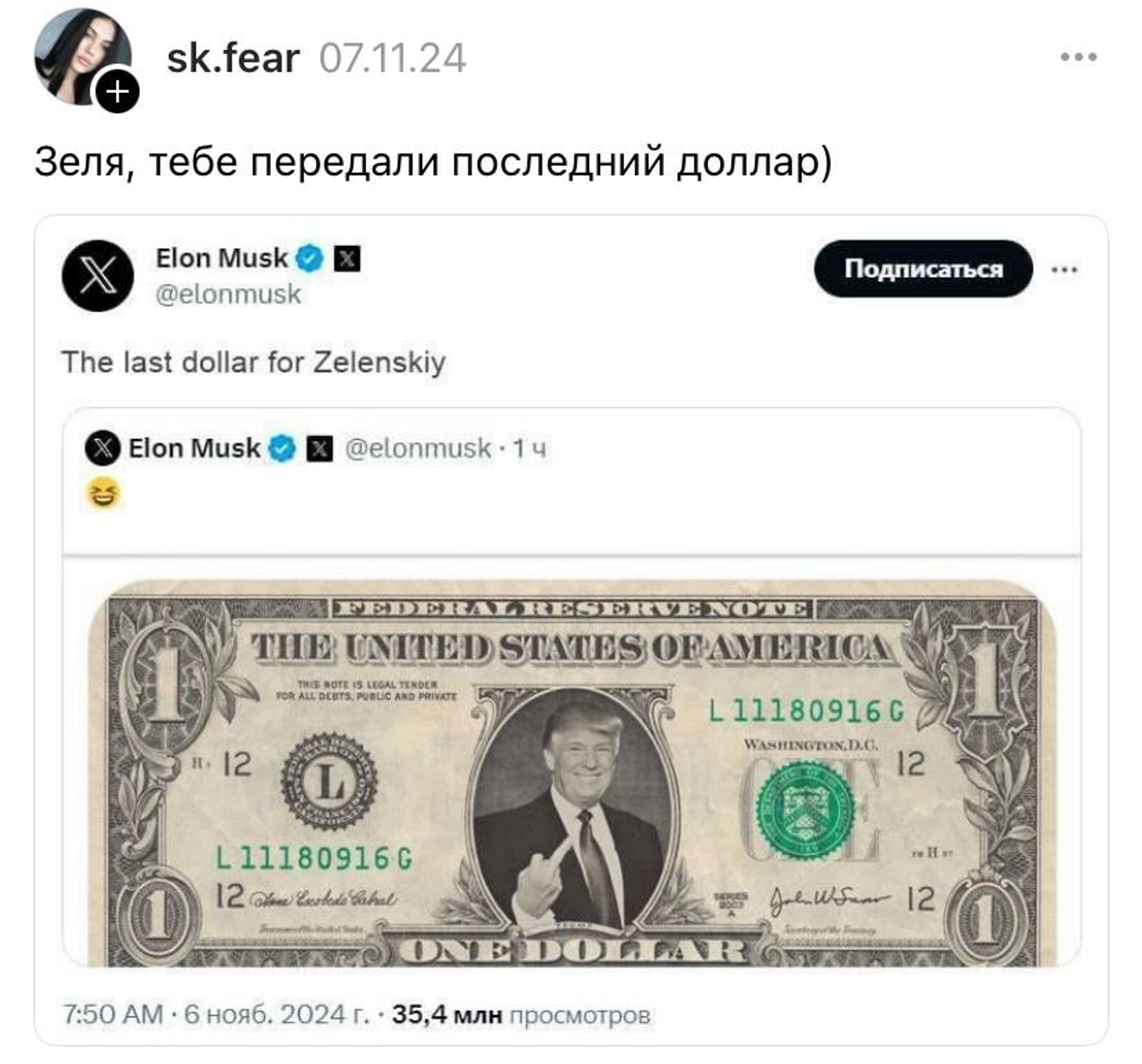 2 октября 2023 года Илон Маск запостил картинку, на которой к известному мему человека с напряженным лицом приделано лицо Зеленского и поставлена подпись на английском: «Когда прошло уже пять минут, а ты еще не попросил помощи на миллиард долларов».
