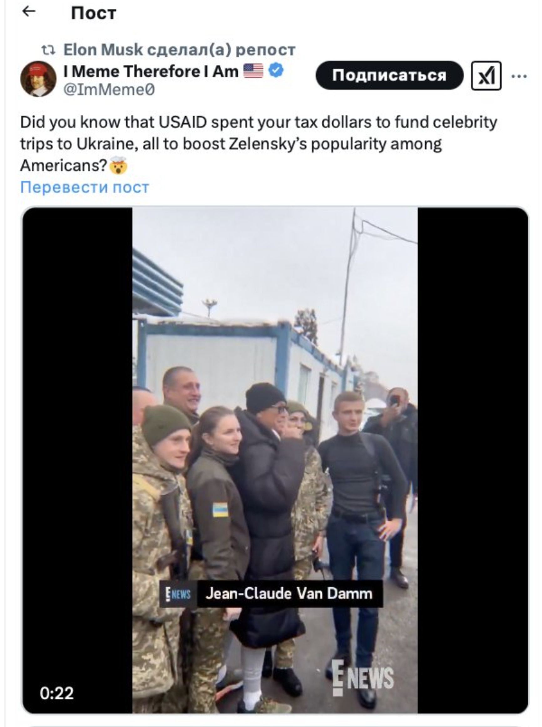 Помог Маск и российской сети дезинформационных каналов, прозванной журналистами «Матрёшка» и связанной с российскими спецслужбами. Он ретвитнул видео с фейком о том, что USAID платило знаменитостям за поездки в Украину.