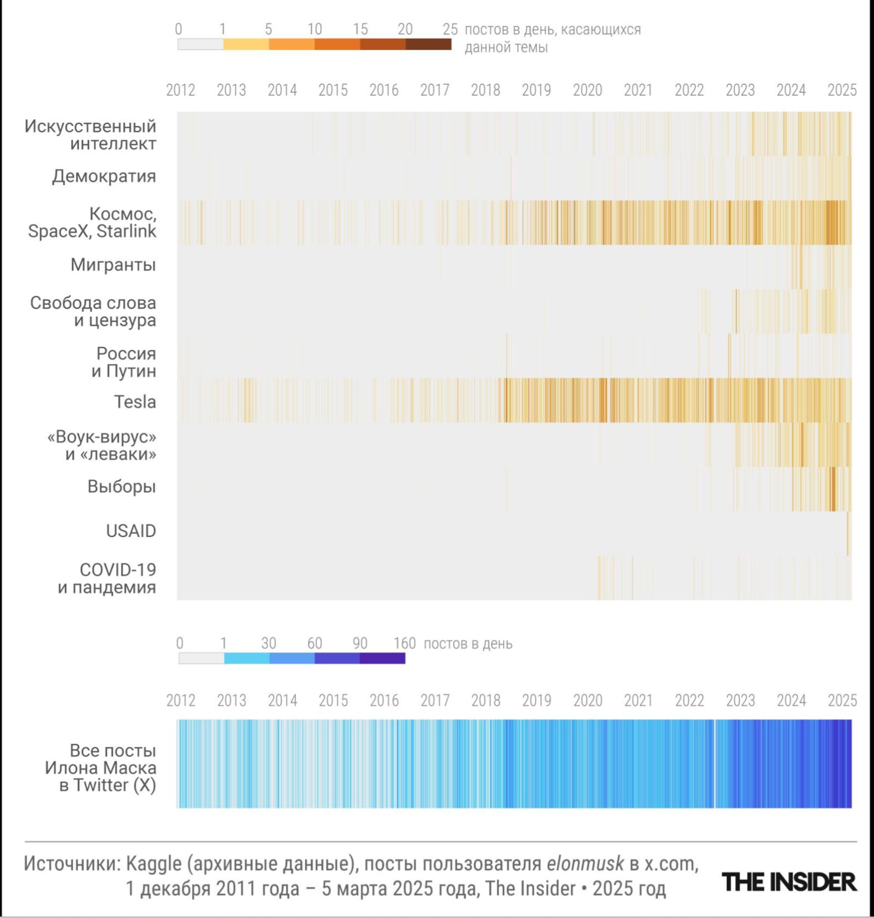 В российских СМИ страшилка об американском госдолге стала намного популярнее после вторжения в Украину, свидетельствует анализ The Insider. Сам же Маск на эту, как и на многие другие темы, до конца 2024 года вообще не высказывался. Теперь же национальному долгу посвящена немалая часть его постов в Х. С начала 2025 года он написал об этом как минимум 140 раз — больше, чем за весь прошедший год (а еще раньше тема госдолга и растраты бюджета США его не интересовала вовсе).