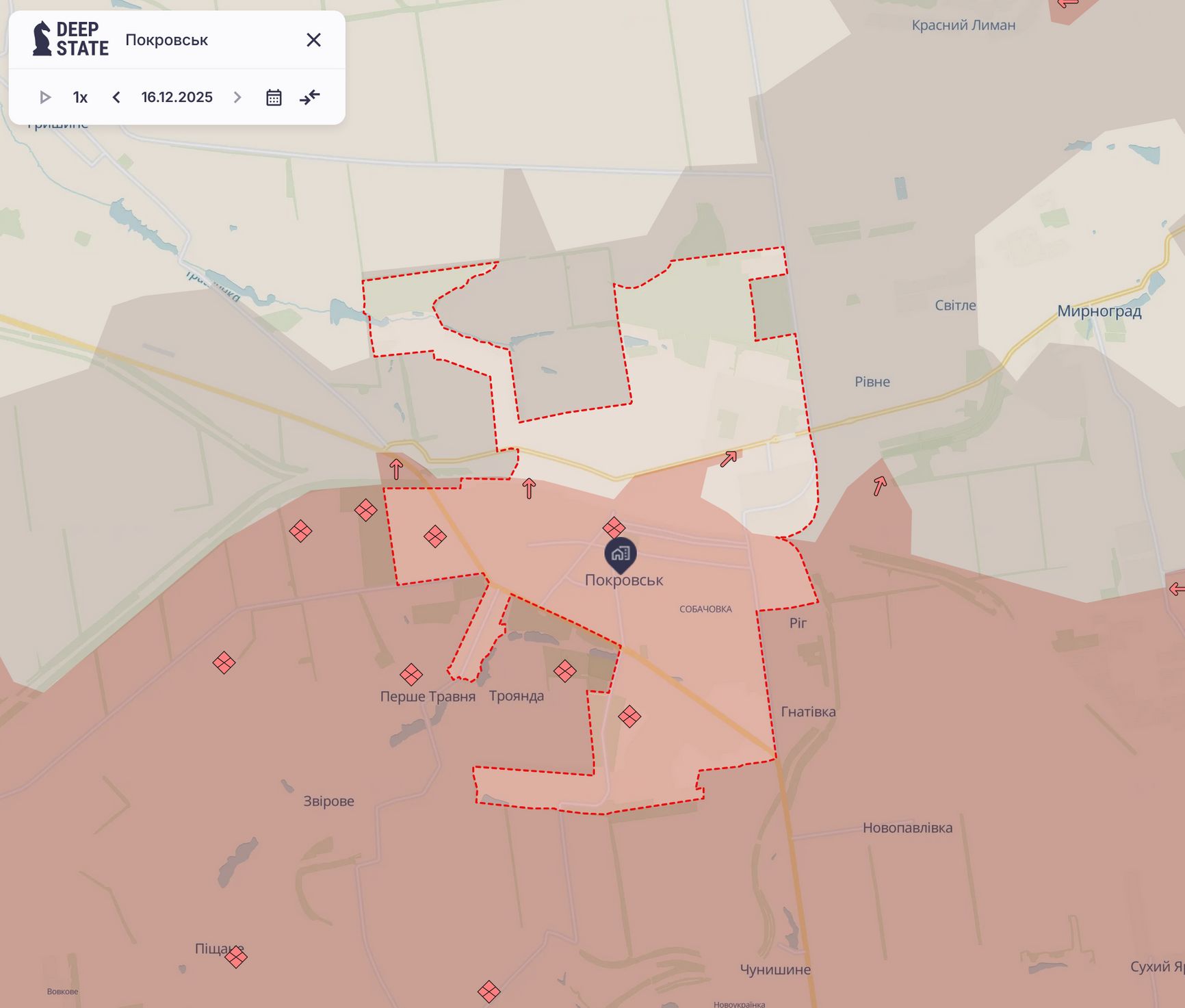 О взятии Покровска (в российских источниках используется советское название города — Красноармейск) в Донецкой области объявляли несколько раз; последнее на текущий момент — заявление министра обороны Андрея Белоусова на той самой коллегии, где выступал Путин. В тот же день командующий ВСУ Александр Сырский заявил, что Украина в ходе контрнаступательных действий вернула контроль над 16 км² в северной части города. Покровск — один из двух райцентров, о взятии которых рапортовала Россия в 2025 году; его население на 1 января 2022 года составляло 60127 человек.