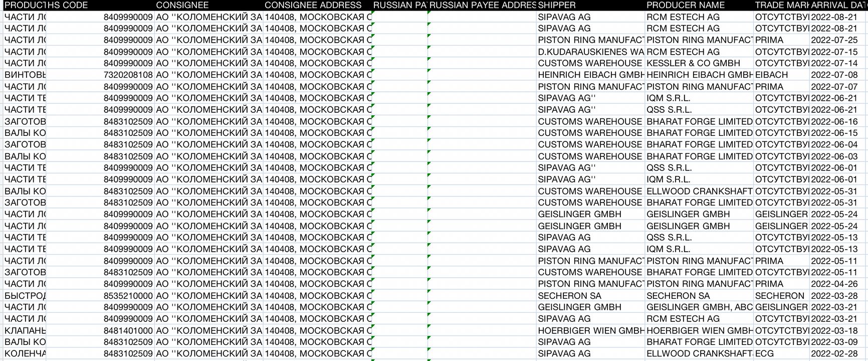 Еще одни покупатели продукции из Европы — олигархи Искандар Махмудов и Андрей Бокарев. Они контролируют АО «Коломенский завод», поставляющее Минобороны дизельные двигатели для военных кораблей. Части для двигателей типа Д500 «Коломенскому заводу» продает Sipavag AG из Швейцарии, D.Kudarauskienes Warehouse из Литвы и Geislinger GmbH из Австрии.