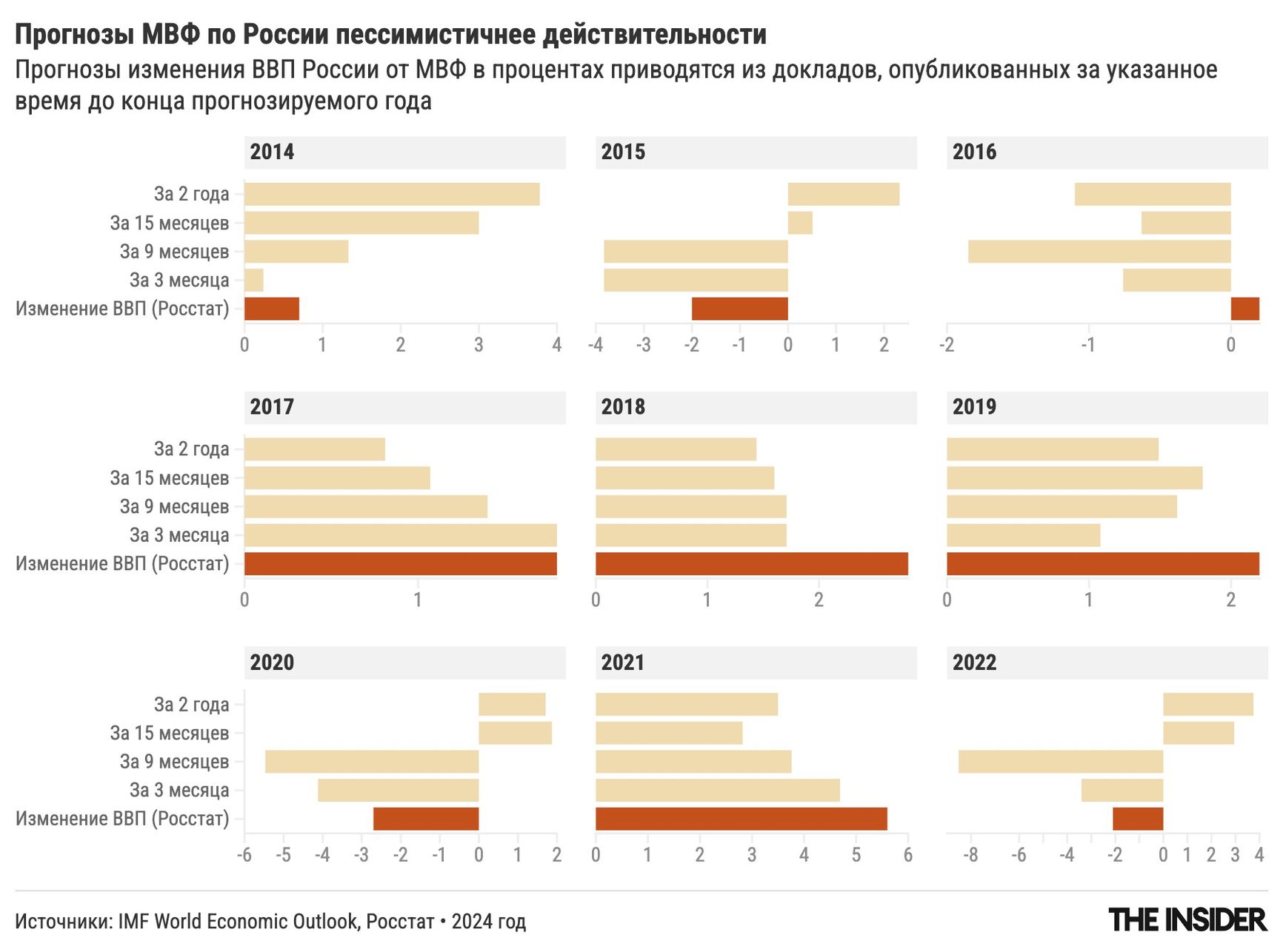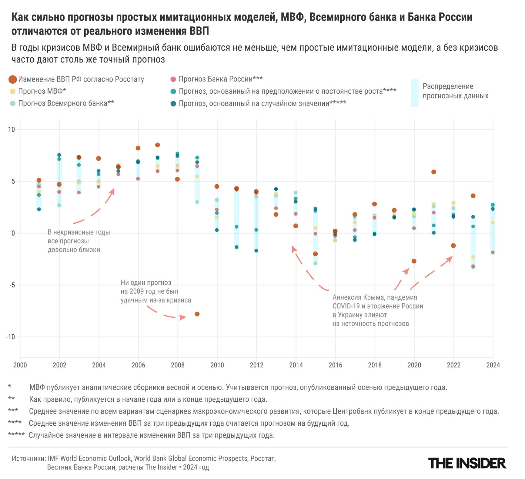 Чтобы понять, насколько этот прогноз плохой, The Insider сравнил его с показателем, при котором никакой экспертный анализ вообще не производится: мы просто берем средний рост за последние три года и считаем, что таким он будет и в следующем году. Такой «прогноз» тоже дает MAPE чуть меньше 1 для всех лет и чуть менее 0,8 для допандемийных прогнозов. Таким образом инерционный псевдопрогноз, который любой пятиклассник может посчитать в тетрадке умножением в столбик, оказывается не просто таким же по точности, но даже чуть-чуть «точнее», чем прогноз, сделанный ведущими мировыми экспертными центрами, вооруженными сложнейшими теориями и математическими моделями.