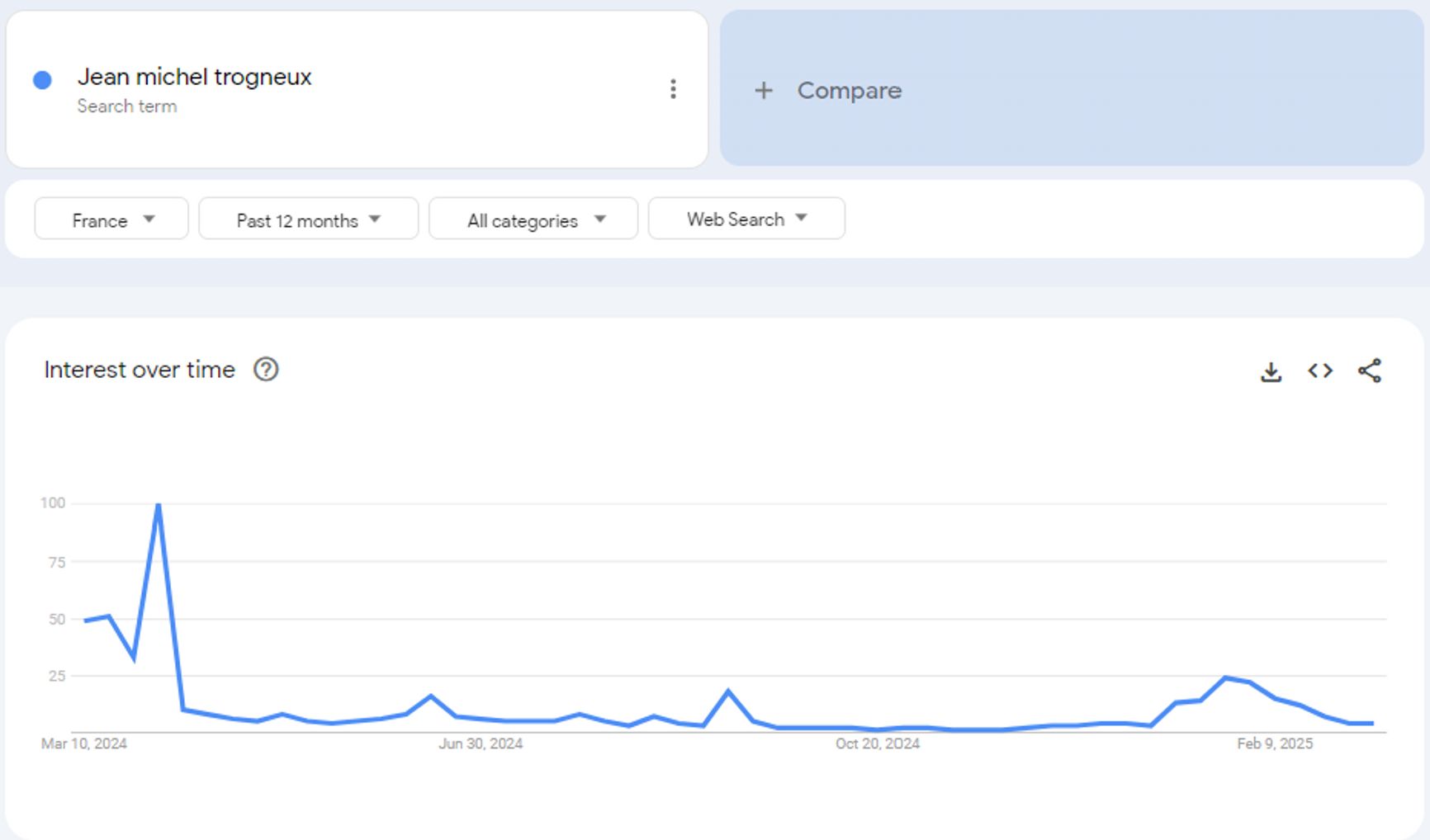 As Google Trends show, the interest in Owens's “exposés” on the part of the French public has since waned considerably. Here's how the number of searches for “jean michel trogneux” has changed over the past year.