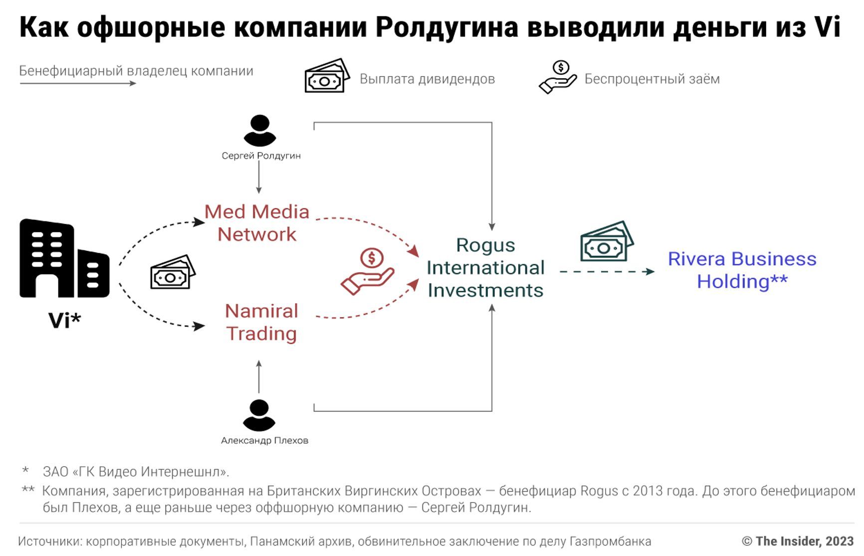 Namiral Trading, a company based in Cyprus, also held shares in Vi. According to the disclosed information, Namiral Trading joined the capital of Vi in 2012. In 2013, the company had 7.5 billion rubles ($95,962,500) in receivables, 8.6 billion rubles ($110,354,082) in payables, and paid 277 million rubles ($3,554,428) in dividends to the beneficial owners for the year. The structure of the balance sheet suggests that Namiral Trading was used as a “pipeline” to funnel money. Based on its financial statements, it is estimated that at least $200 million was funneled through Namiral Trading in this way.