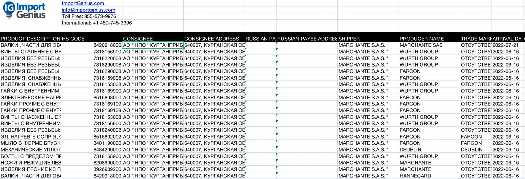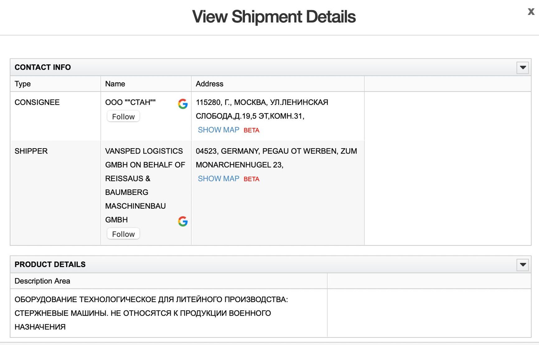 Moscow-based Stan LLC, a developer of modern numerically controlled machine tools, is part of the Rostec State Corporation. Despite Rostec being sanctioned, the German company Vansped Logistics (on behalf of Reißaus & Baumberg Maschinenbau GmbH) has already supplied Stan with technical equipment for foundries after the start of Russia’s invasion of Ukraine. According to the ImportGenius database, deliveries were made in July 2022.