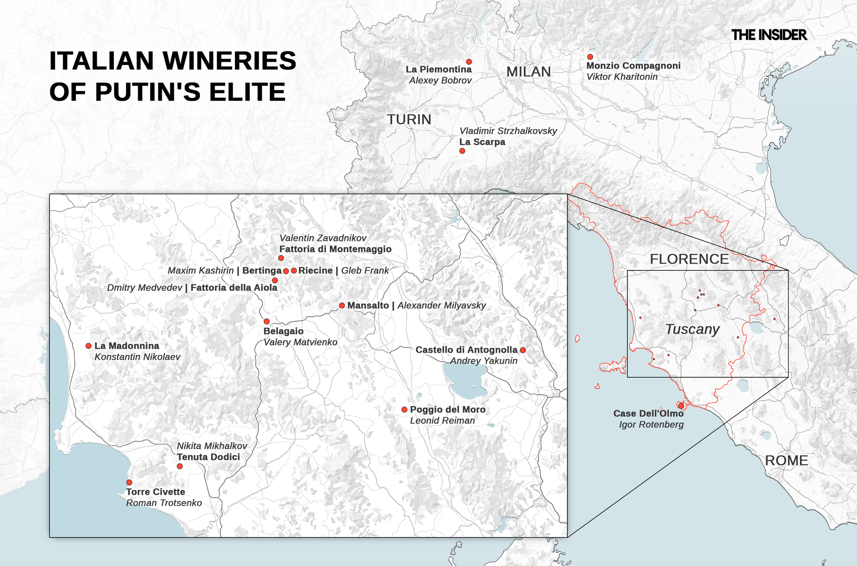 The Insider lifts the veil on this opaque system with a brief tour through the Italian vineyards owned by members of Putin’s circle of allies and cronies.
