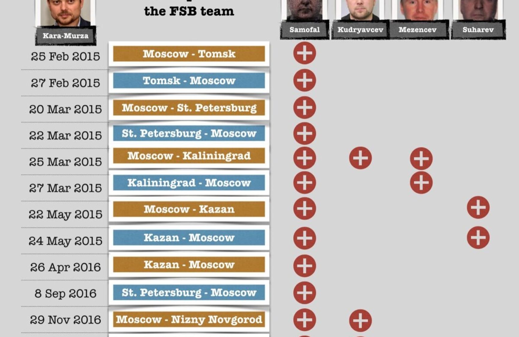 We discovered that at least three months prior to the poisoning, the FSB poisoners began following Kara-Murza. They followed him to Tomsk, St. Petersburg, Kaliningrad, and Kazan. His last trip to Kazan ended on May 24, 2015, that is, less than 48 hours prior to the onset of the symptoms.