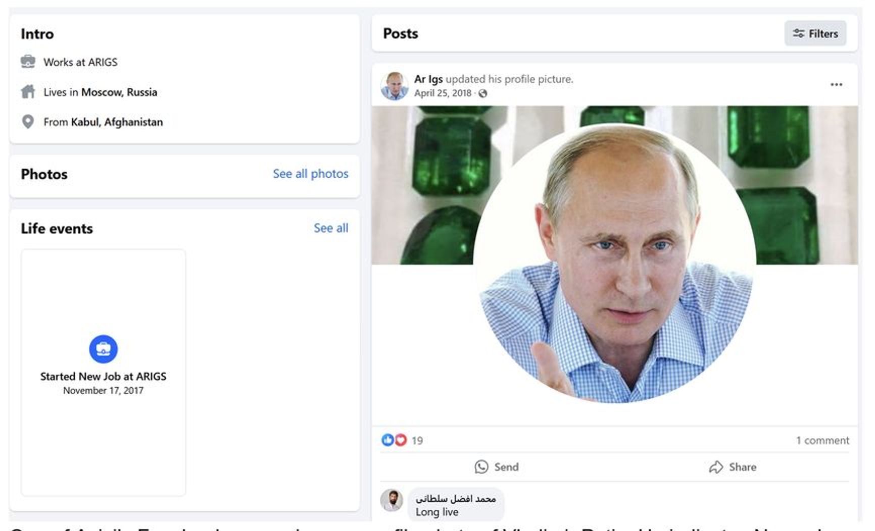 On one of his active Facebook pages, where Azizi refers to himself as “Ar Igs,” the profile picture is a photo of Vladimir Putin. The page indicates November 17, 2017 as the start date for Azizi’s job at ARIGS, Ltd. On one of his other Facebook accounts discovered by The Insider, his profile page was changed in June 2016 to feature a big picture of Putin. Underneath it, Azizi commented: “In the hope that one day we will also have the same president.”