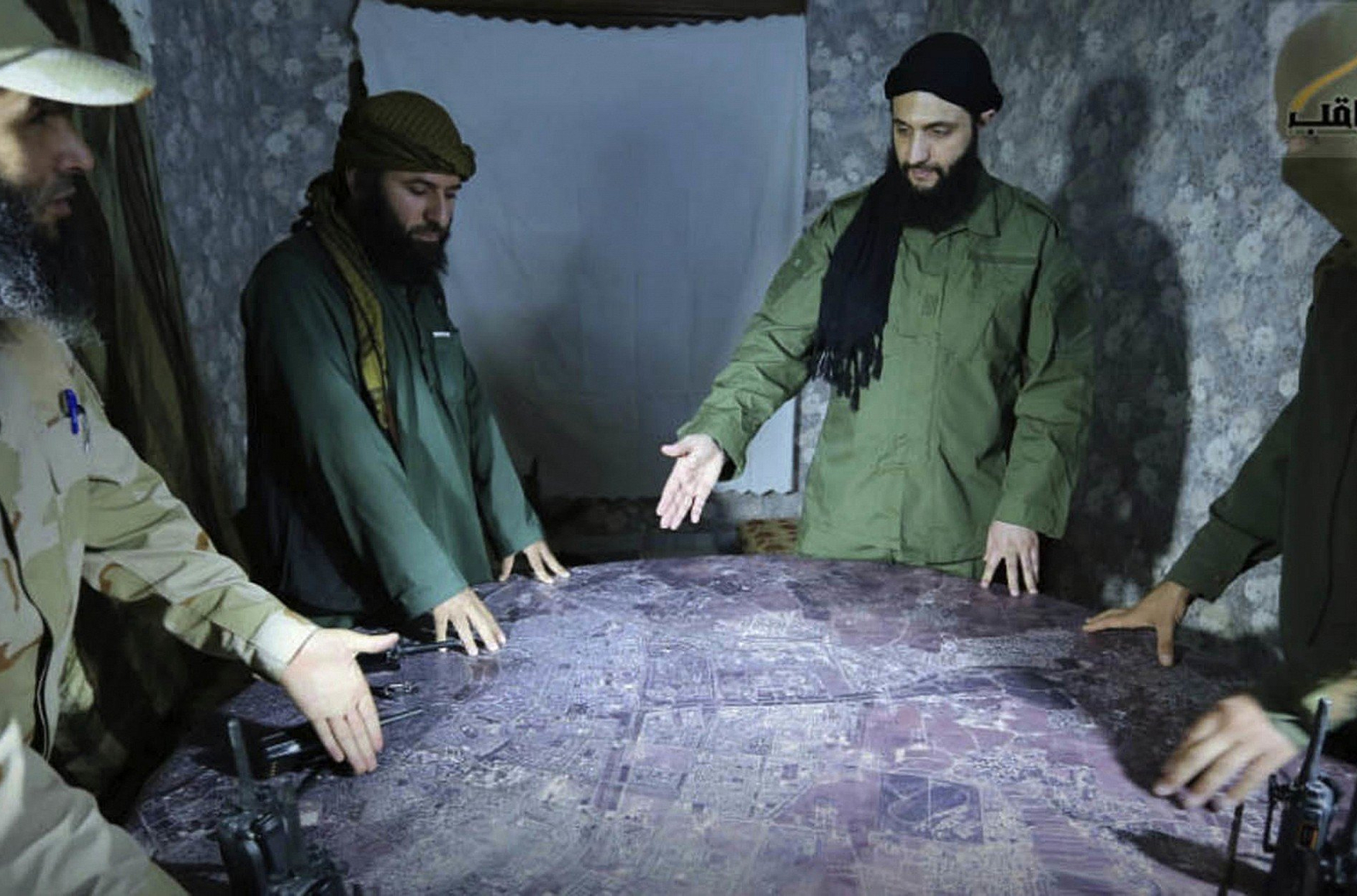 Ahmad al-Sharaa (second from right), then known by his nom de guerre Abu Mohammad al-Julani, discussing battlefield details with field commanders over a map in Aleppo, Syria, in an undated photo released in 2016. Photo: AP
