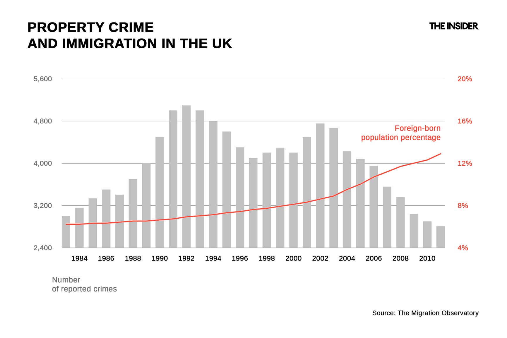 Similar statistics can be observed globally: although the number of migrants worldwide has surged in recent decades — from 154 million in 1990 to over 300 million today — crime rates in developed countries have steadily declined. In the UK, property offenses (such as theft or robbery) fell from 5,100 to 2,800 cases per year over the same period amid a comparable increase in migration.