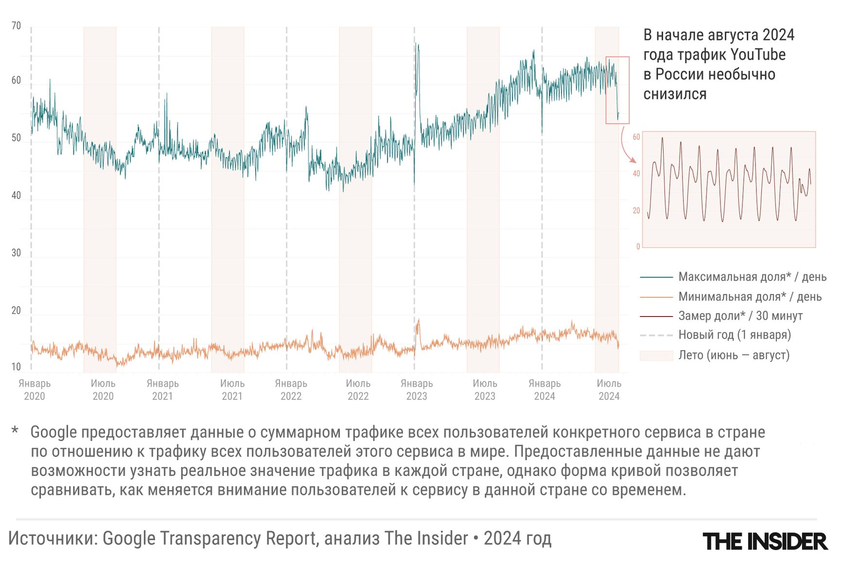 Трафик YouTube в целом изменяется параллельно с общим трафиком рунета, который летом несколько снизился из-за сезонного фактора, но год к году показывает скорее рост: