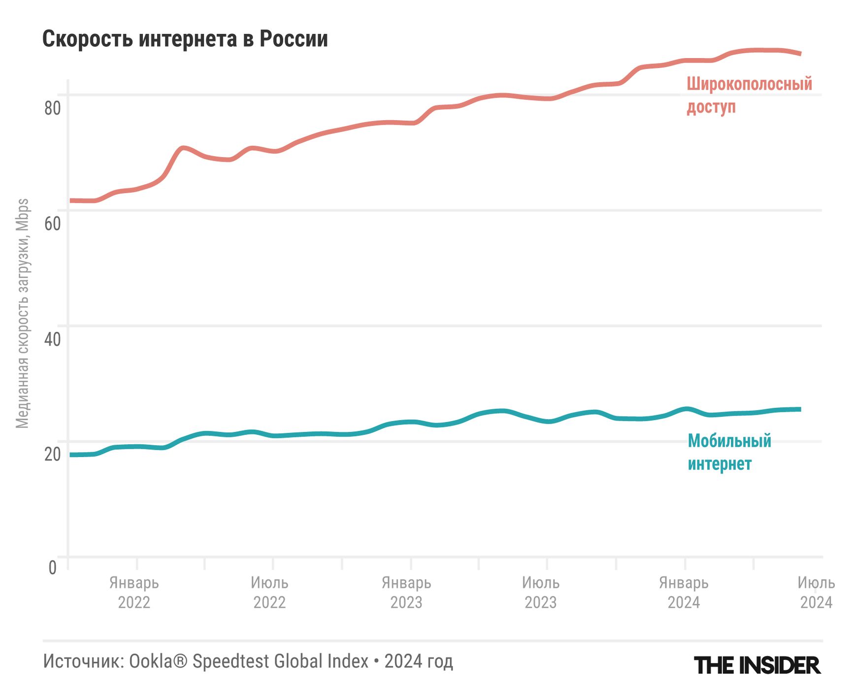 Скорость интернета в России, казалось бы, год от года только растет. По данным компании Ookla, которая составляет рейтинги скорости как мобильного, так и широкополосного интернета во всём мире, медианная скорость соединения в России с конца 2021 года выросла на 41% для домашнего интернета и на 44,5% для мобильной связи. Но пока Россия занимает лишь 86 место в мире по средней скорости мобильного интернета и 60-е место — по скорости широкополосного.