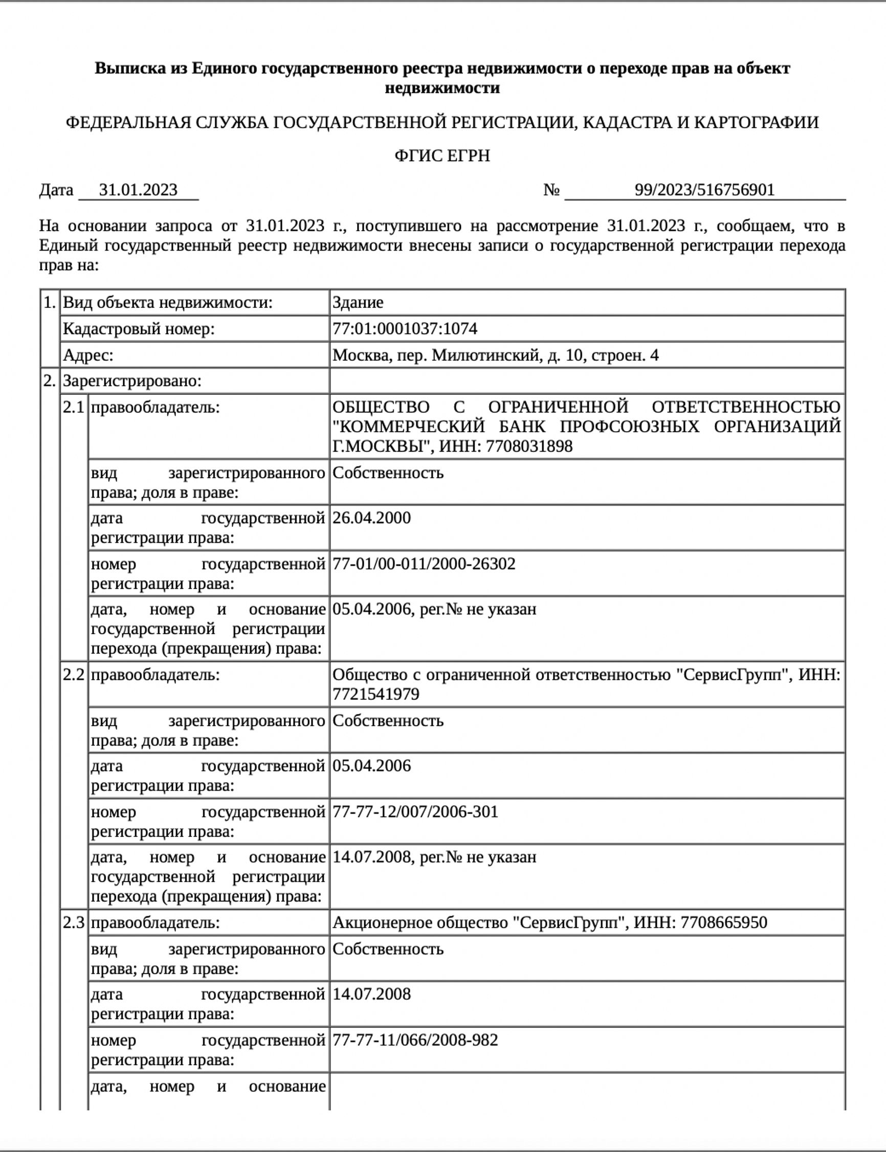 По имеющейся у The Insider выписке из Росреестра, АО «СервисГрупп» с 2008 года владеет зданием по адресу: Милютинский переулок, д. 10, стр. 4. Это шестиэтажное строение площадью 2338,5 м².