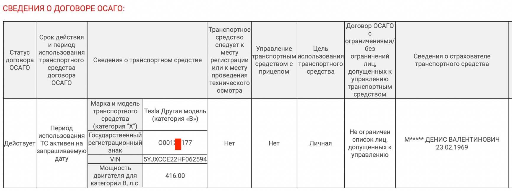 У самого вице-премьера, правда, есть в собственности «Лада Vesta», но вряд ли он ее использует: на момент подготовки материала у автомобиля был просроченный полис ОСАГО. Зато всё в порядке с полисом у принадлежащего Мантурову автомобиля Tesla.