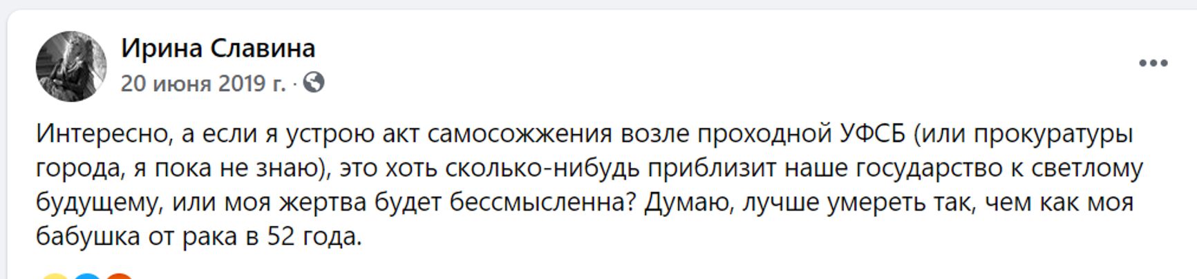 Судя по Facebook-аккаунту Славиной, о самосожжении в знак протеста против произвола властей она начала задумываться как минимум год назад: