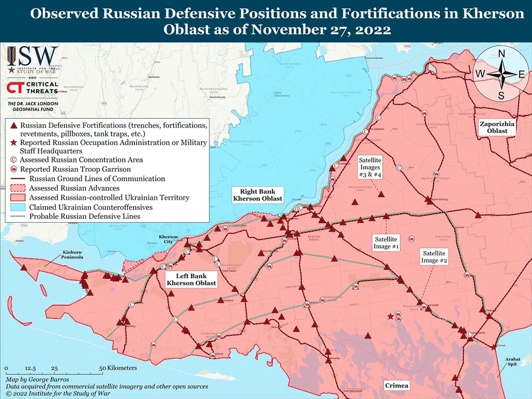 Большинство полевых фортификационных сооружений российских военных расположены на линиях разграничения и в основном перпендикулярны дорогам, сообщает Институт по изучению войны (ISW) в регулярной сводке. Российские военные осознают, что украинские силы могут форсировать реку Днепр и вести контрнаступательные операции в восточной части Херсонской области, возможно, угрожая всем критически важным наземным коммуникациям от Крыма до материковой части Украины.