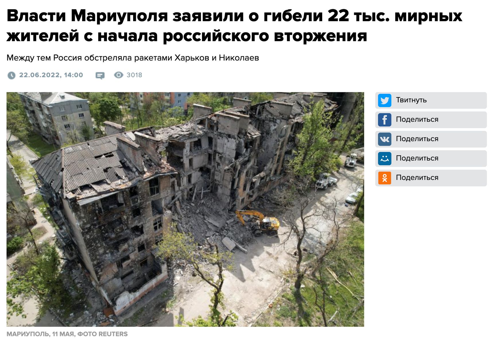 В частности, РКН потребовал удалить новости об обстреле российскими военными украинского города Винницы, в результате которого погибли более 20 человек, а также новость о 22 тысячах погибших мирных жителей аннексированного Мариуполя.