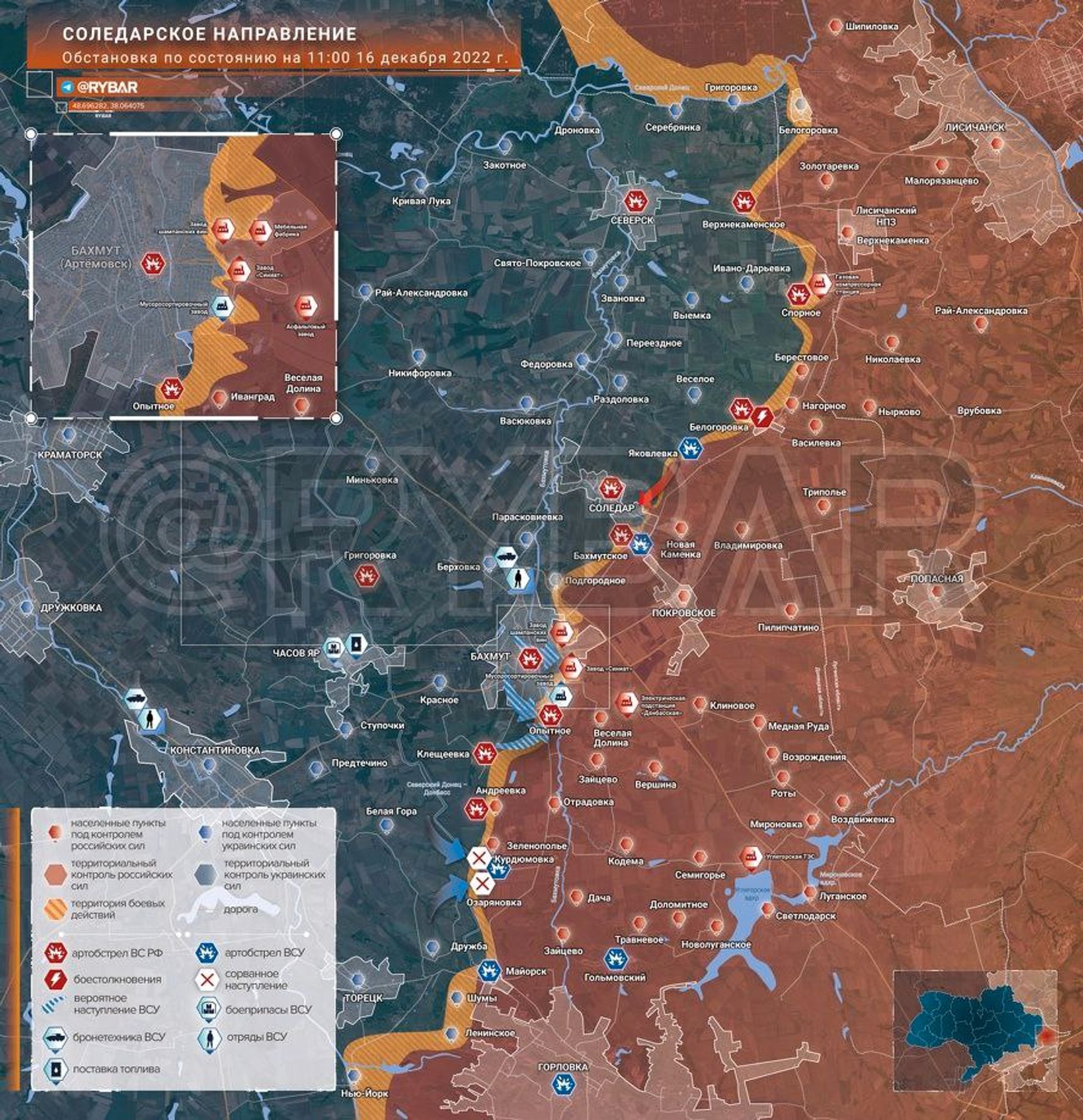 Генштаб ВСУ утверждает, что на Бахмутском направлении — самой горячей точке фронта — украинские военные отбили Курдюмовку и Озаряновку, которые российская армия заняла в начале декабря. При этом Z-канал «Рыбарь» утверждает, что атаки на Озаряновку были отбиты. По данным канала, украинцы в ближайшее время пойдут в контрнаступление на Бахмутском участке, чтобы оттеснить россиян на 10–15 км от линии фронта. Яковлевка на Соледарском участке якобы «зачищена» «вагнеровцами», утверждает канал, подготовлен плацдарм для наступления на Соледар. То же самое говорит российский «военкор» Роман Романов. Пропагандистский проект WarGonzo отмечает, что сам Бахмут находится «под плотным огнем артиллерии», ВСУ там ждут подкрепления.