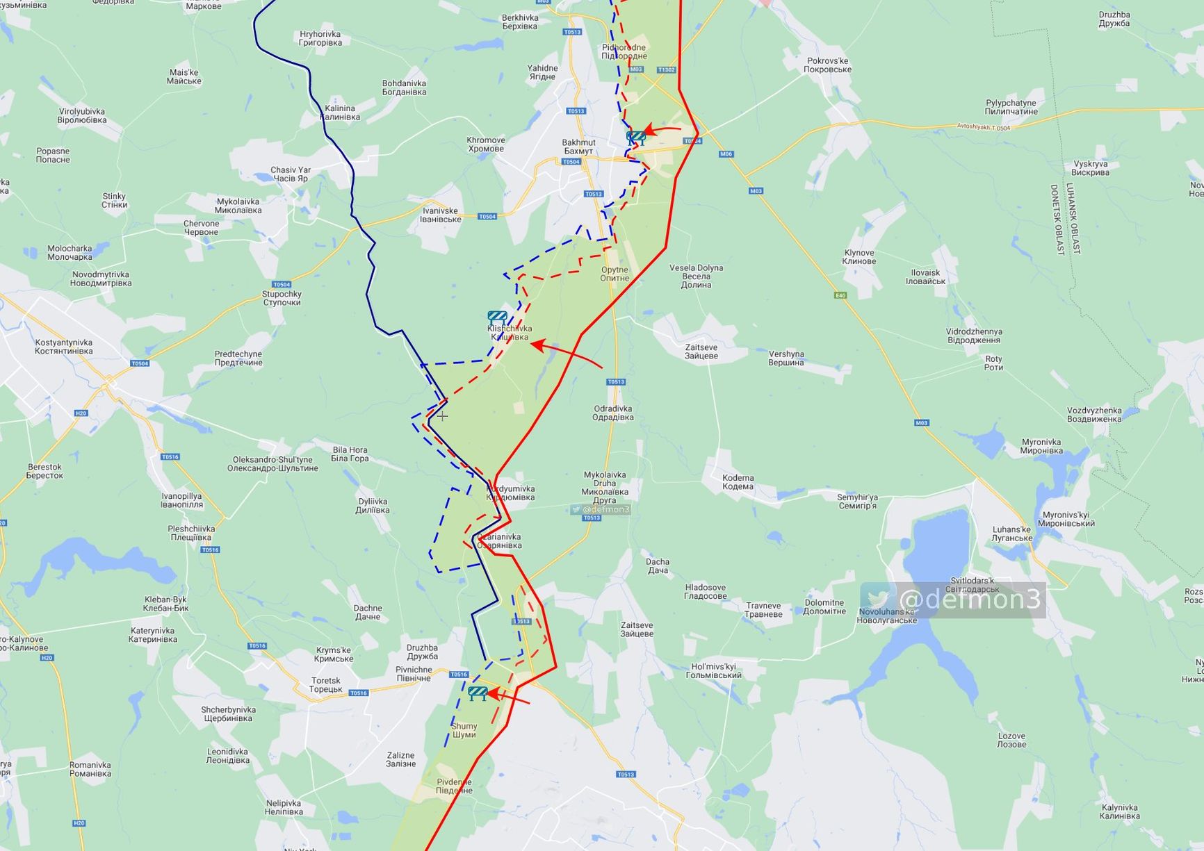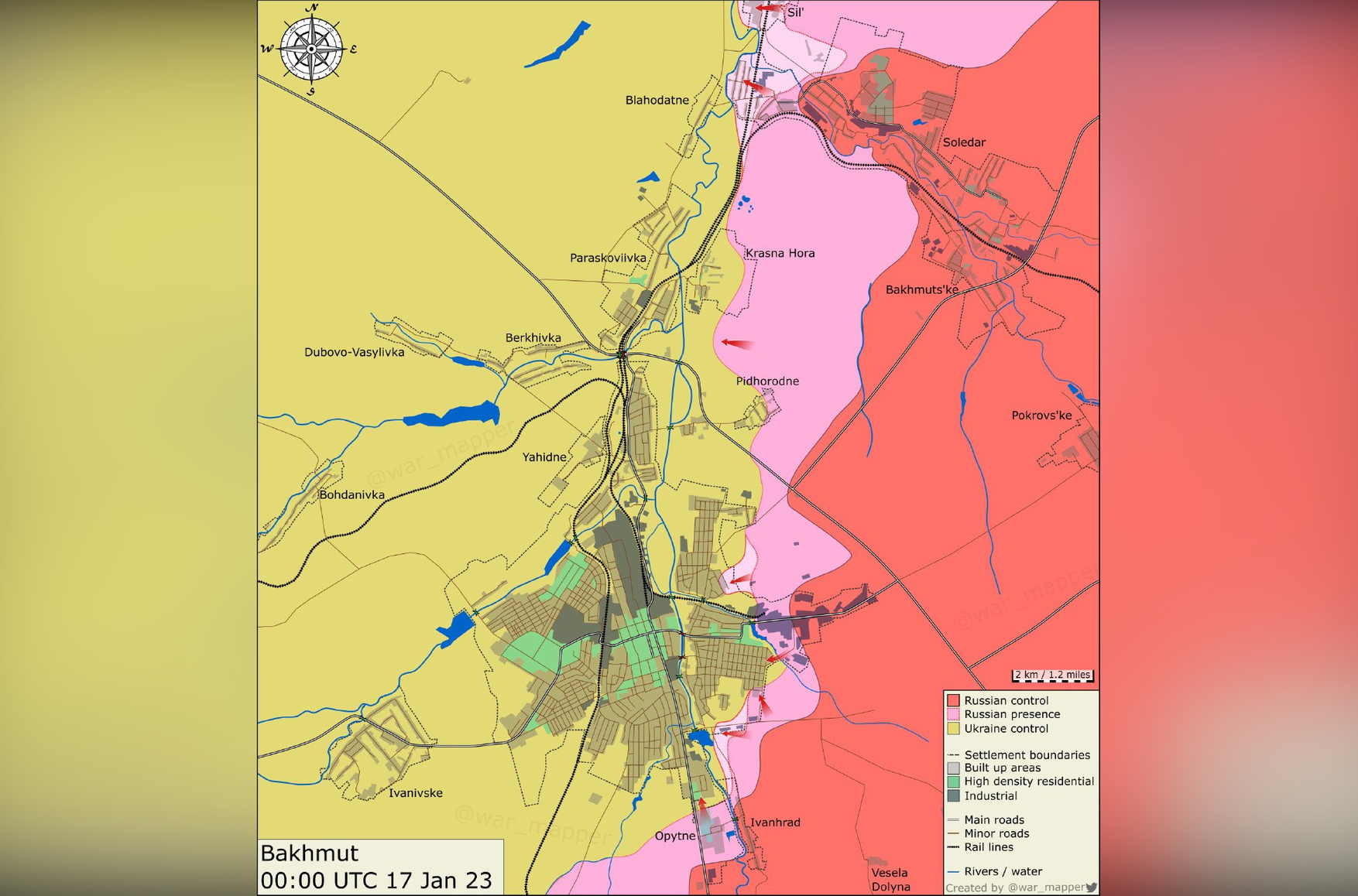 Ситуация вокруг Бахмута, где шли самые ожесточенные бои, за последнюю неделю изменилась, утверждает портал War Mapper, публикуя карту. По данным аналитиков, российская армия окончательно захватила Соледар и поселок Соль, зашла в новые районы на северо-востоке Бахмута, а также взяла под контроль промышленные здания на юго-востоке. Пророссийский Telegram-канал «Рыбарь» также утверждает, что 16 января ЧВК Вагнера заняла поселок Соль, перерезав снабжение между Бахмутом и Северском и открыв плацдарм к выходу к Северской агломерации. Основные бои идут в районе ключевого участка — Клещиевки, расположенной южнее Бахмута, пишет аналитик Def Mon.