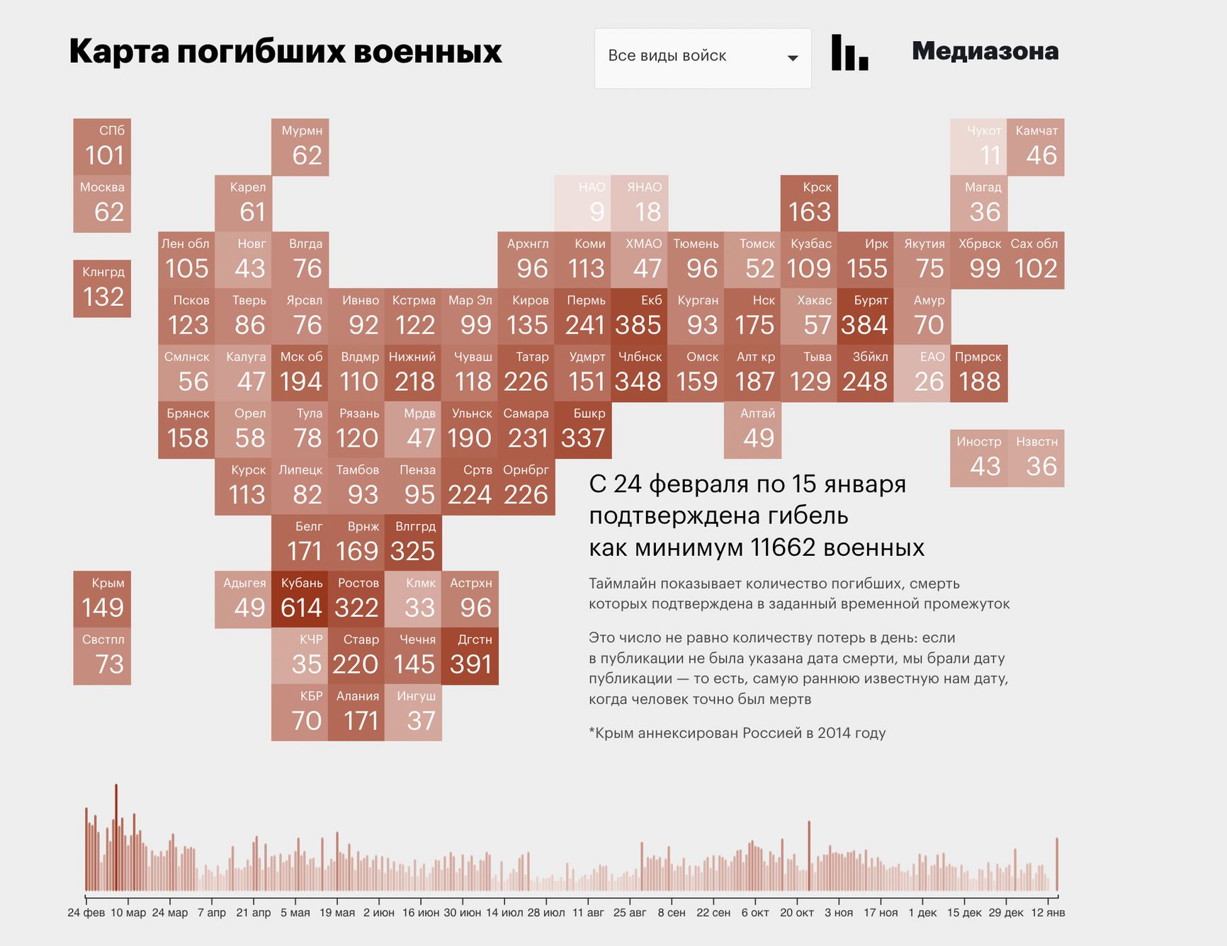 За 16 дней в списке появились 942 новых имени, что является рекордом за всё время войны. Из них 49 фамилий — погибшие в Макеевке при ударе в ночь на 1 января. Официально Минобороны признало гибель 89 человек, но поименный список публиковать отказалось, журналисты нашли 49 из них. По данным расследователей, резкий рост погибших из Краснодарского края объясняется тем, что волонтеры посчитали имена на кладбище в станице Бакинской, где хоронят наемников из ЧВК Вагнера. Однако большая часть захороненных на нем может быть из других регионов.
