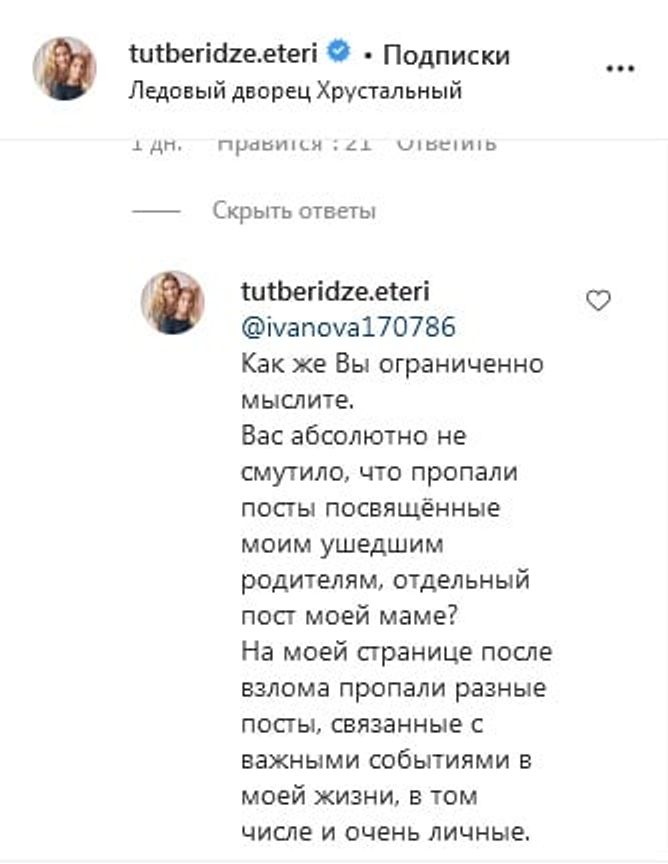 «Как же вы ограниченно мыслите. Вас абсолютно не смутило, что пропали посты, посвященные моим ушедшим родителям, отдельный пост о моей маме? На моей странице после взлома пропали разные посты, связанные с важными событиями в моей жизни, в том числе и очень личные».