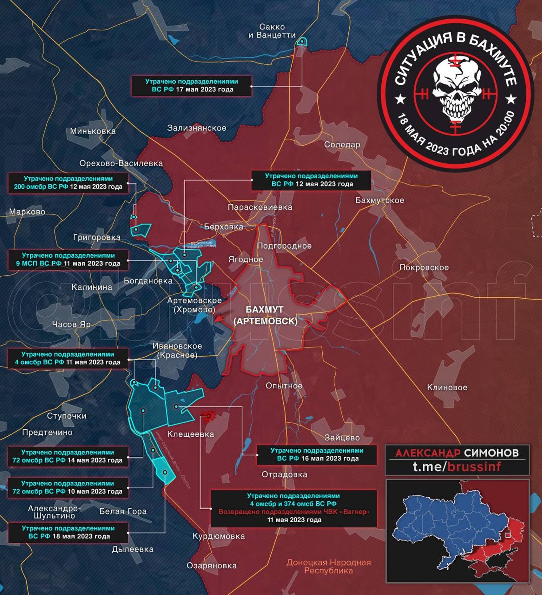 Близкие к ЧВК Вагнера медийные ресурсы продолжают скрупулезно картографировать успехи украинских войск. «Военкор» Александр Симонов выложил новую версию карты с обстановкой в районе Бахмута.