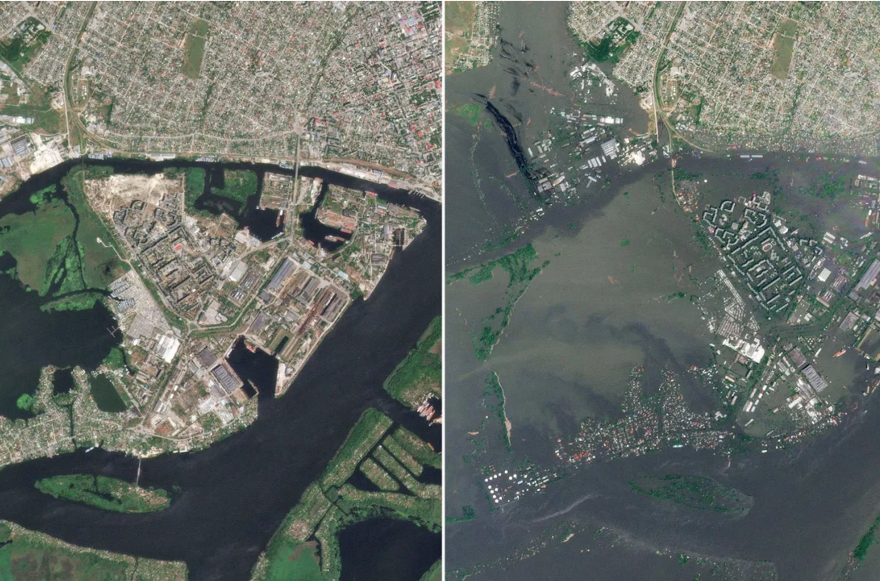 Появились также спутниковые снимки распространения воды на территории левобережья Днепра. В то же время местное управление МВД, по данным украинских СМИ, фиксирует, что скорость повышения уровня воды снизилось.