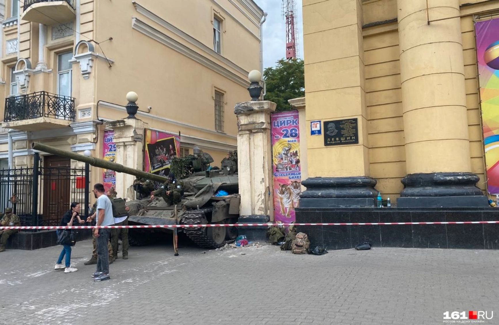 Когда в соцсети попало фото, на котором танк «застрял» в одном из служебных выездов из цирка, ростовские СМИ уточнили, что танк «так поставили», чтобы преградить въезд.