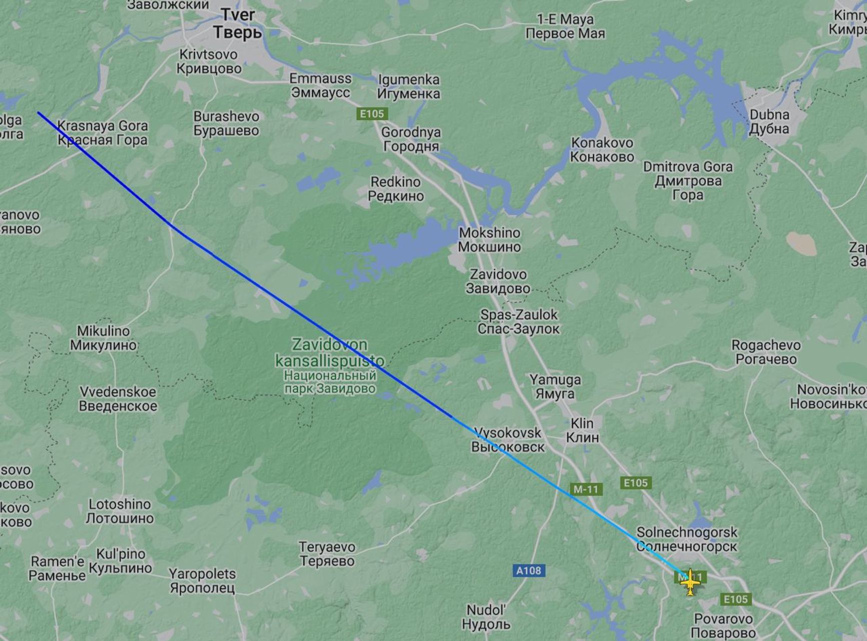 Согласно данным сервиса Flightradar, борт вылетел сегодня из аэропорта в районе Солнечногорска Московской области в сторону Тверской области.