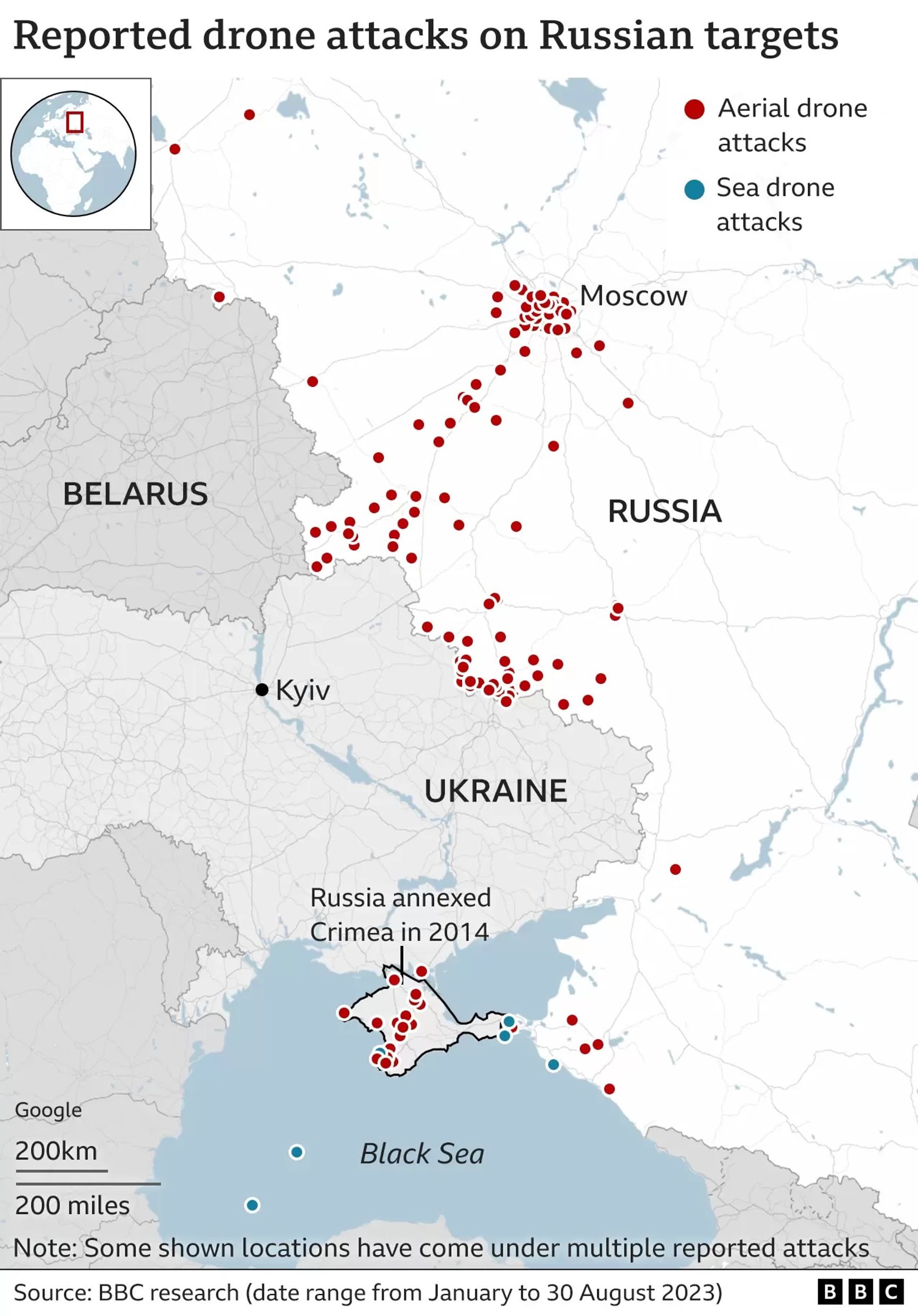 В материале Би-Би-Си опубликована карта зафиксированных случаев атак беспилотников и БЭК по российским целям с января по 30 августа 2023 года.