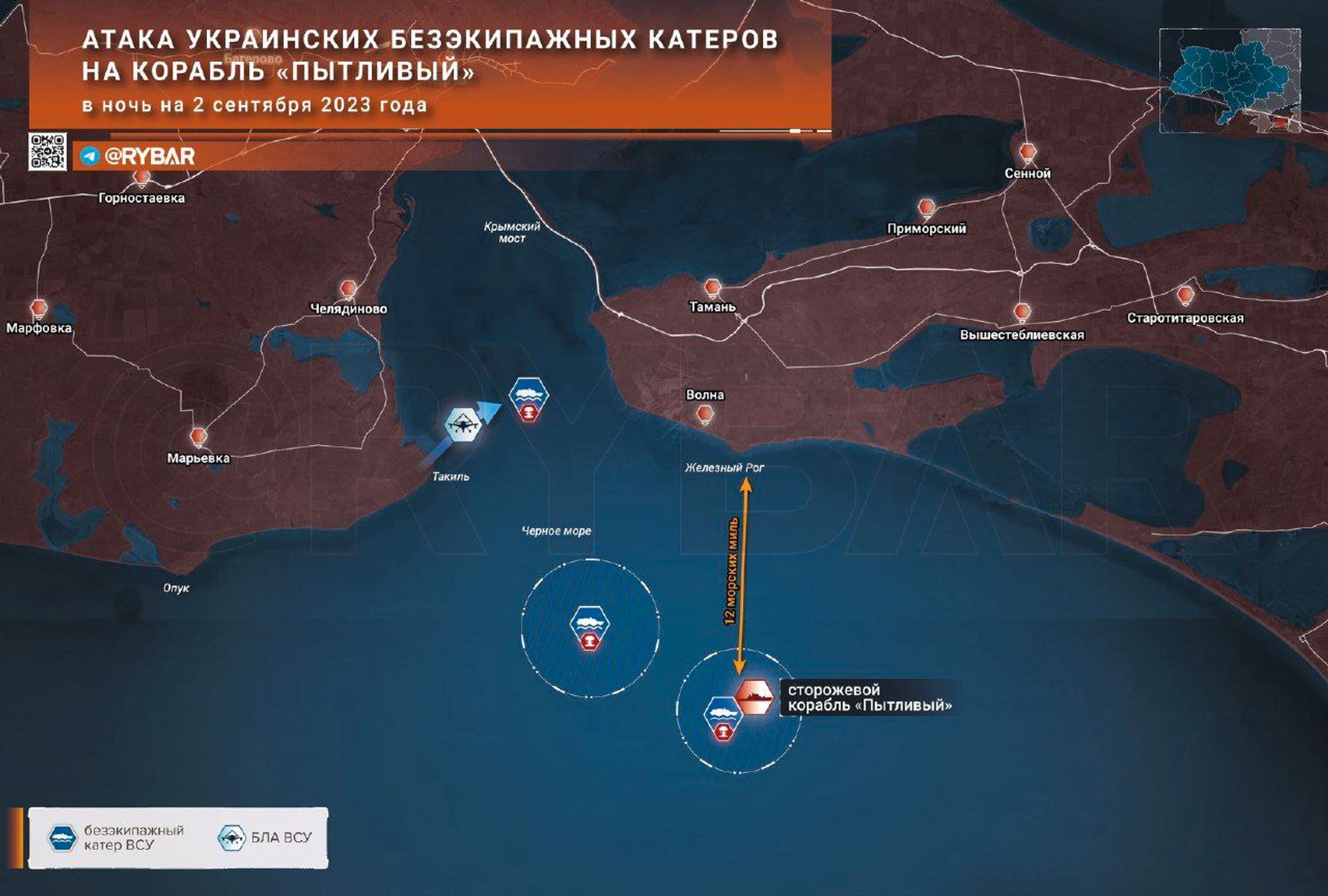 По данным «Рыбаря», первый катер уничтожили пограничники из стрелкового оружия на южной стороне Керченского пролива, второй — южнее мыса Железный Рог в Краснодарском крае поразил экипаж сторожевого корабля «Пытливый». Авторы канала полагают, что морские беспилотники изначально ставили целью удар по «Пытливому», а не по Крымскому мосту.