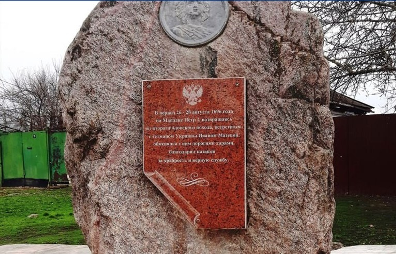 Табличка на памятнике, установленном в 1997 году, рассказывала о встрече Петра I и гетмана Украины Ивана Мазепы в августе 1696 года. Согласно надписи, российский царь «обменялся с ним дорогими дарами, благодарил казаков за храбрость и верную службу».