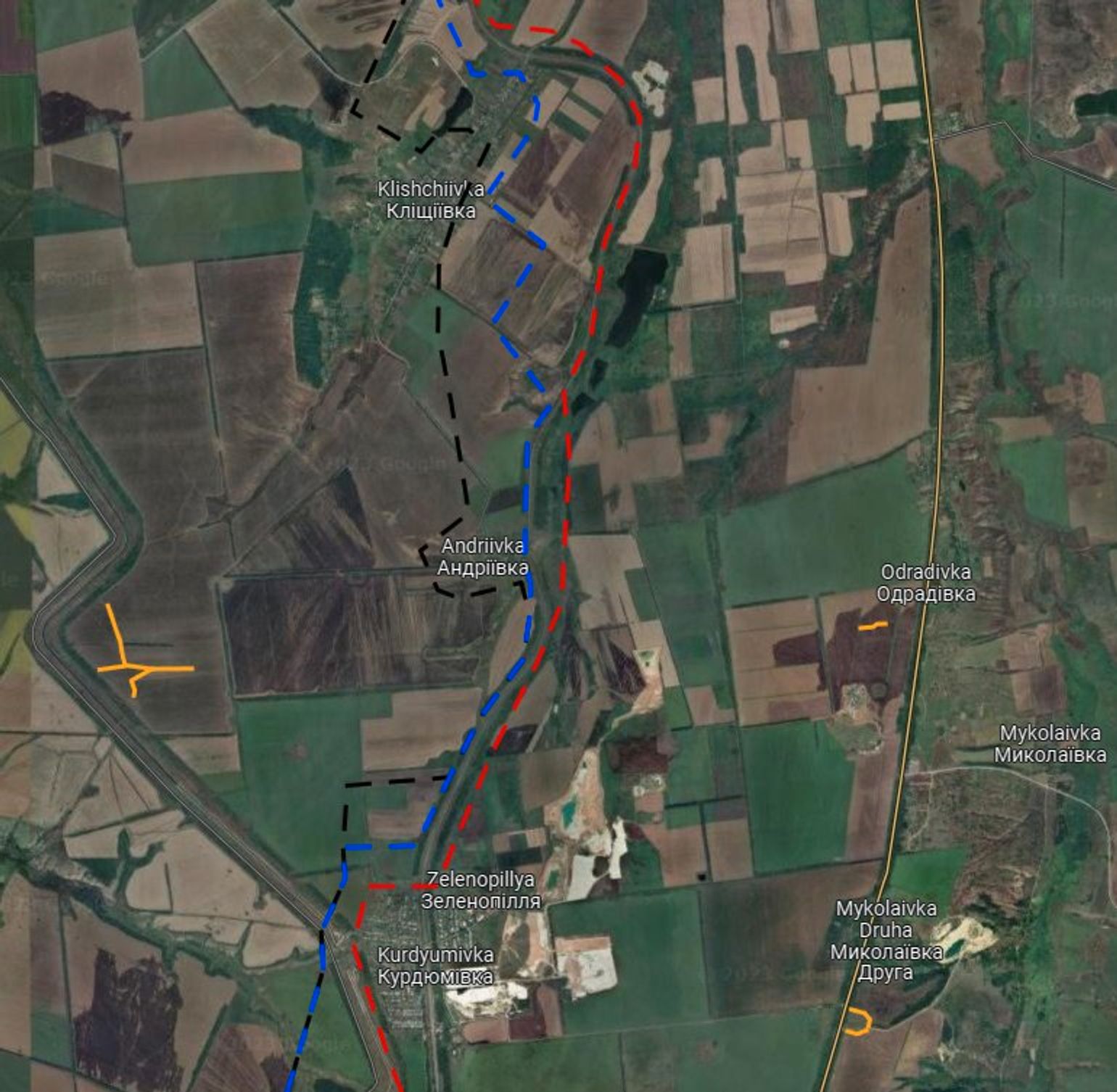 С обеих сторон железнодорожные пути окружены лесопосадками, а дальше лежат открытые поля. На спутниковых снимках видно, что контроль над Андреевкой открывает пути для продвижения на восток, юг и север.