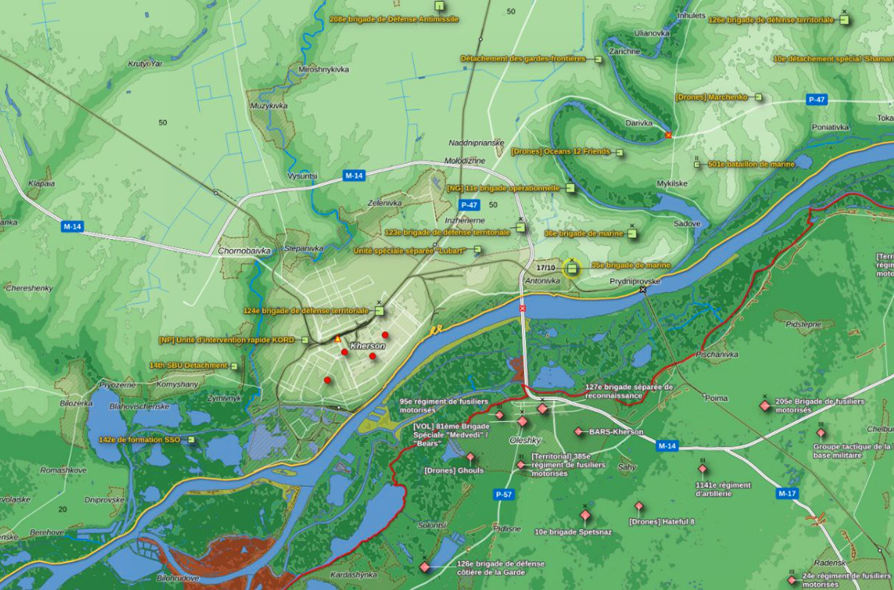 «Рыбарь» сообщает о высадке украинского десанта на левом берегу Днепра. По сведениям авторов канала, вечером 17 октября четыре штурмовых группы из ударной группировки «Катран» высадились возле железнодорожного моста на острове Алешкинский и совершали попытки продвинуться к Песчановке и Пойме. Позже к ним подошло подкрепление.