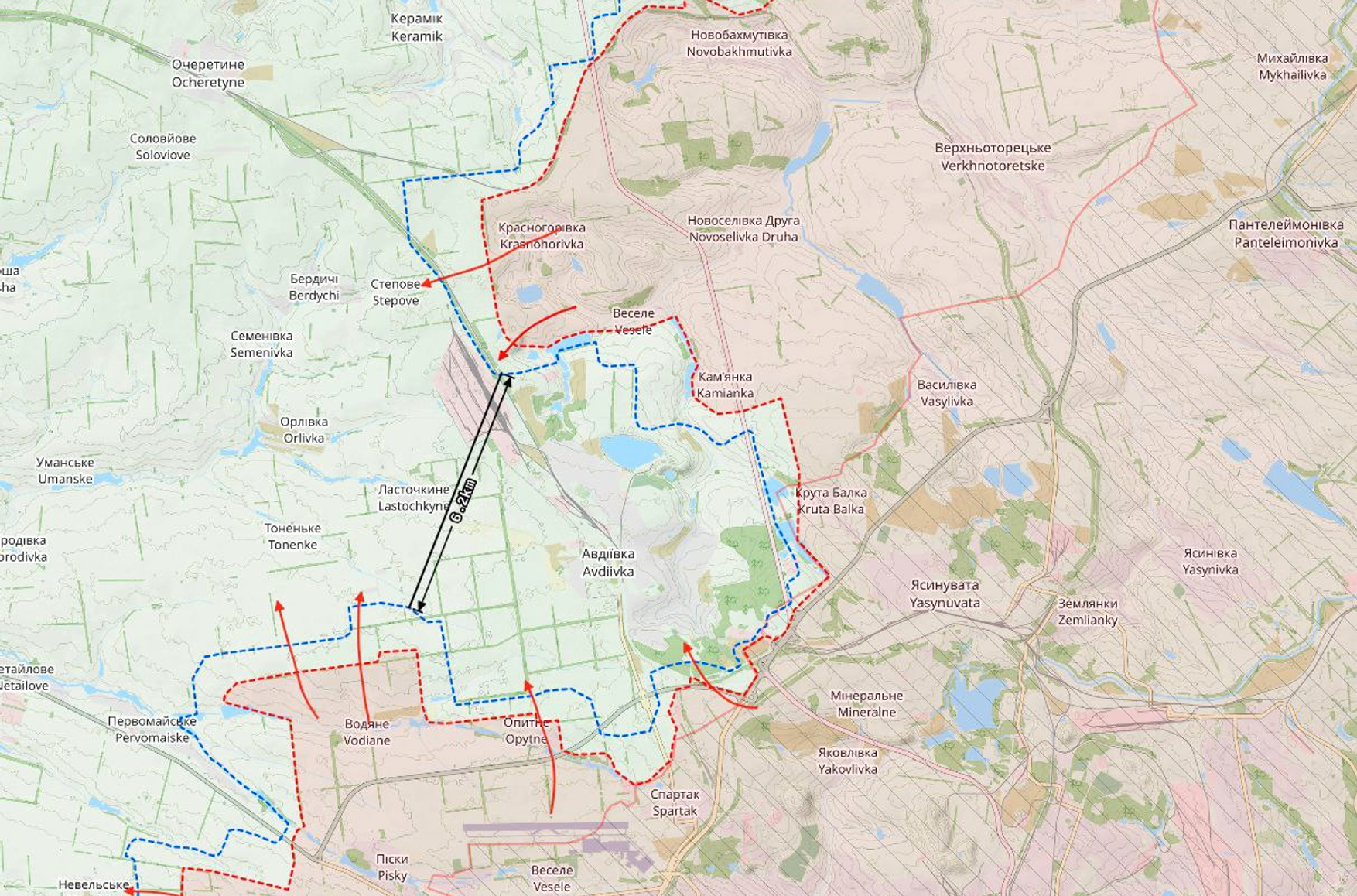 Украинский OSINT-ресурс DeepState констатирует продвижение россиян на северном и южном флангах битвы авдеевского укрепрайона. Также, по данным проекта, россияне «фактически контролируют» террикон под Авдеевкой, однако не могут воспользоваться господствующей высотой, так как со стороны ВСУ «поражению подлежит всё, что движется». Вместе с тем противника удалось отбросить на исходные позиции в районе вентиляционного ствола шахты «Бутовка» к югу от Авдеевки.