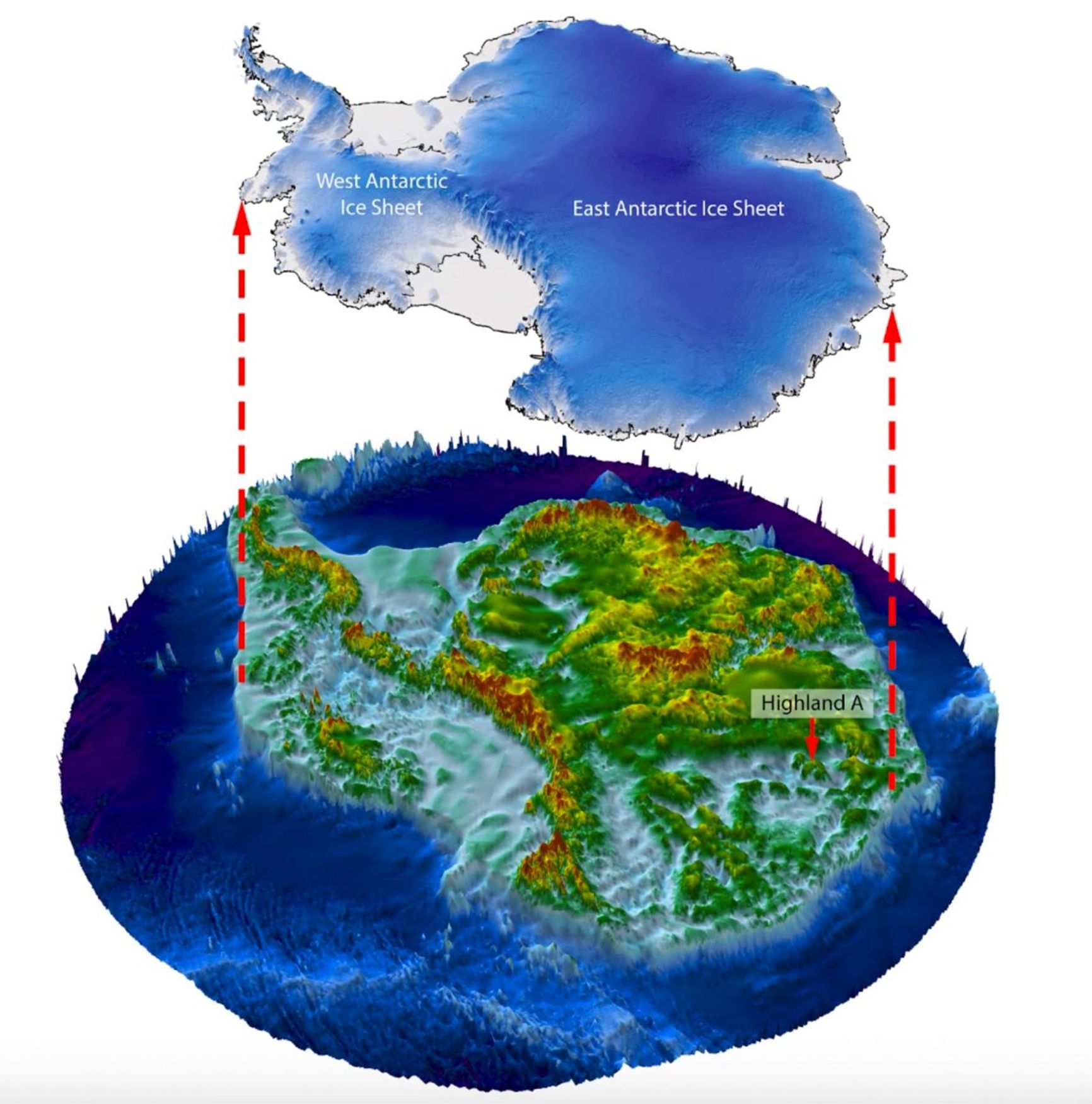 Чтобы понять, какой ландшафт подо льдом, исследователи изучили данные, собранные канадской спутниковой программой RADARSAT. Космические аппараты программы способны обнаруживать мельчайшие аномалии на поверхности льда, которые указывают на рельеф местности под ним. Например, горы, погребенные под слоем льда в 2,5 километра, могут создавать очень тонкие неровности на поверхности ледяного листа, которые не видны с земли или с воздуха, но видны из космоса.