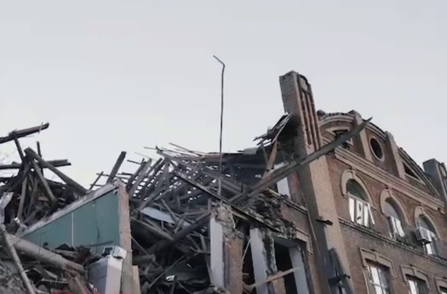 Пушилин пишет, что повреждены четыре объекта, произошло прямое попадание в здание Управления труда и социальной защиты населения. Telegram-канал War Gonzo опубликовал видео, снятое у этого здания, в котором, как утверждается, обрушились крыша и перекрытия. Вскоре видео исчезло из канала.
