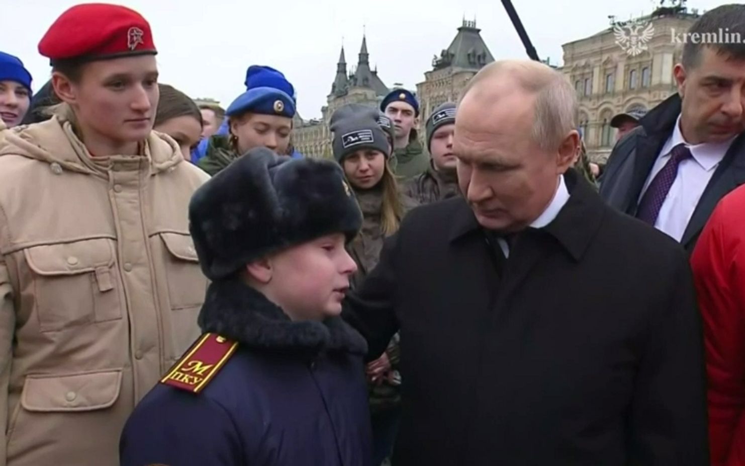 Затем у Путина происходит диалог с мальчиком в форме Московского президентского кадетского училища. Ребенок рассказывает, что его отец погиб на войне в Украине 27 февраля 2022 года. Путин в ответ спрашивает мальчика, как тот учится.