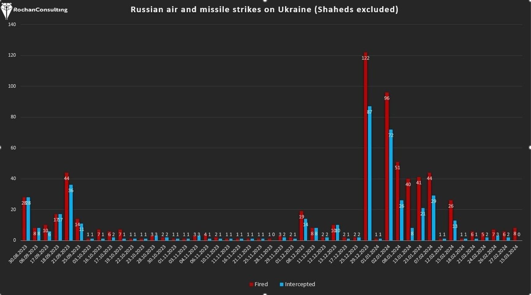 Примечательно, что за последний месяц зафиксировано сравнительно немного ракетных ударов, хотя, по данным украинских официальных лиц, российские производственные мощности по выпуску баллистических и крылатых ракет составляют более 115 единиц в месяц, напоминает военный аналитик Роб Ли.