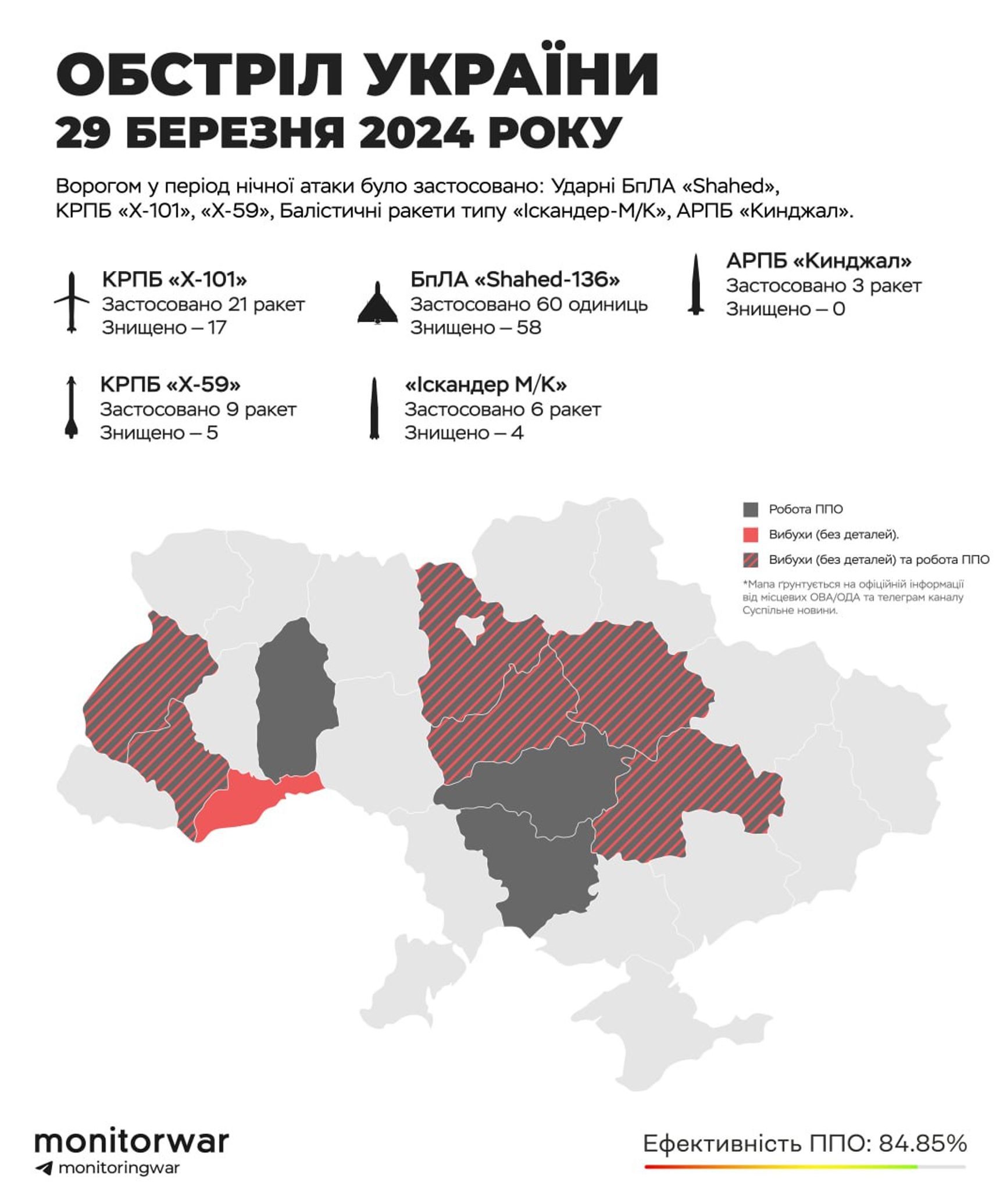 В ночь на 29 марта нанесен массированный удар по Украине, всего было запущено 60 беспилотников типа «Шахед» и 45 различных ракет, включая «Кинжал» и «Искандер-М», сообщает командование Воздушных сил ВСУ. Из них сбито 58 «Шахедов» и 26 крылатых ракет.