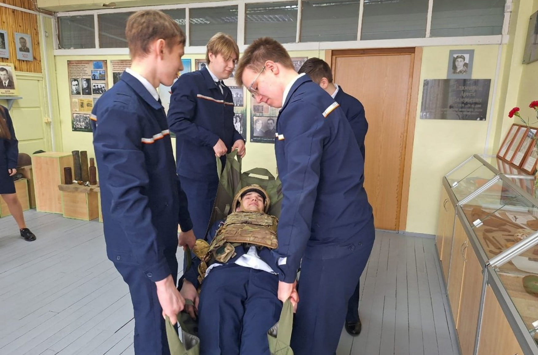 В публикации говорится, что участник войны в Украине принес с собой комплект воинской амуниции, показал содержимое медицинского комплекта и «позволил ребятам на практике почувствовать на себе часть солдатской ноши, а также поучаствовать в эвакуации с поля боя раненого».