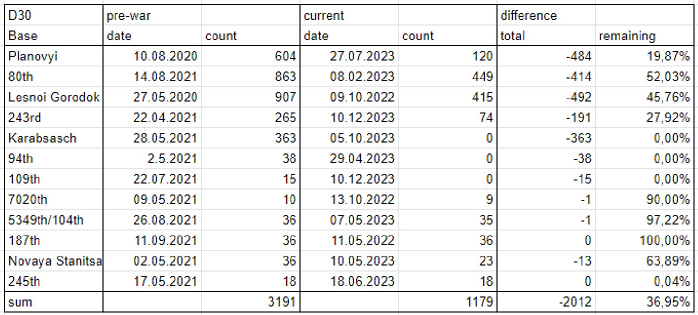 В свою очередь, OSINT-исследователь high_marsed проводит подобную ревизию пушек Д-30. По его подсчетам, если до начала боевых действий в Украине на складах находилась 3191 единица, то теперь — лишь 1179.