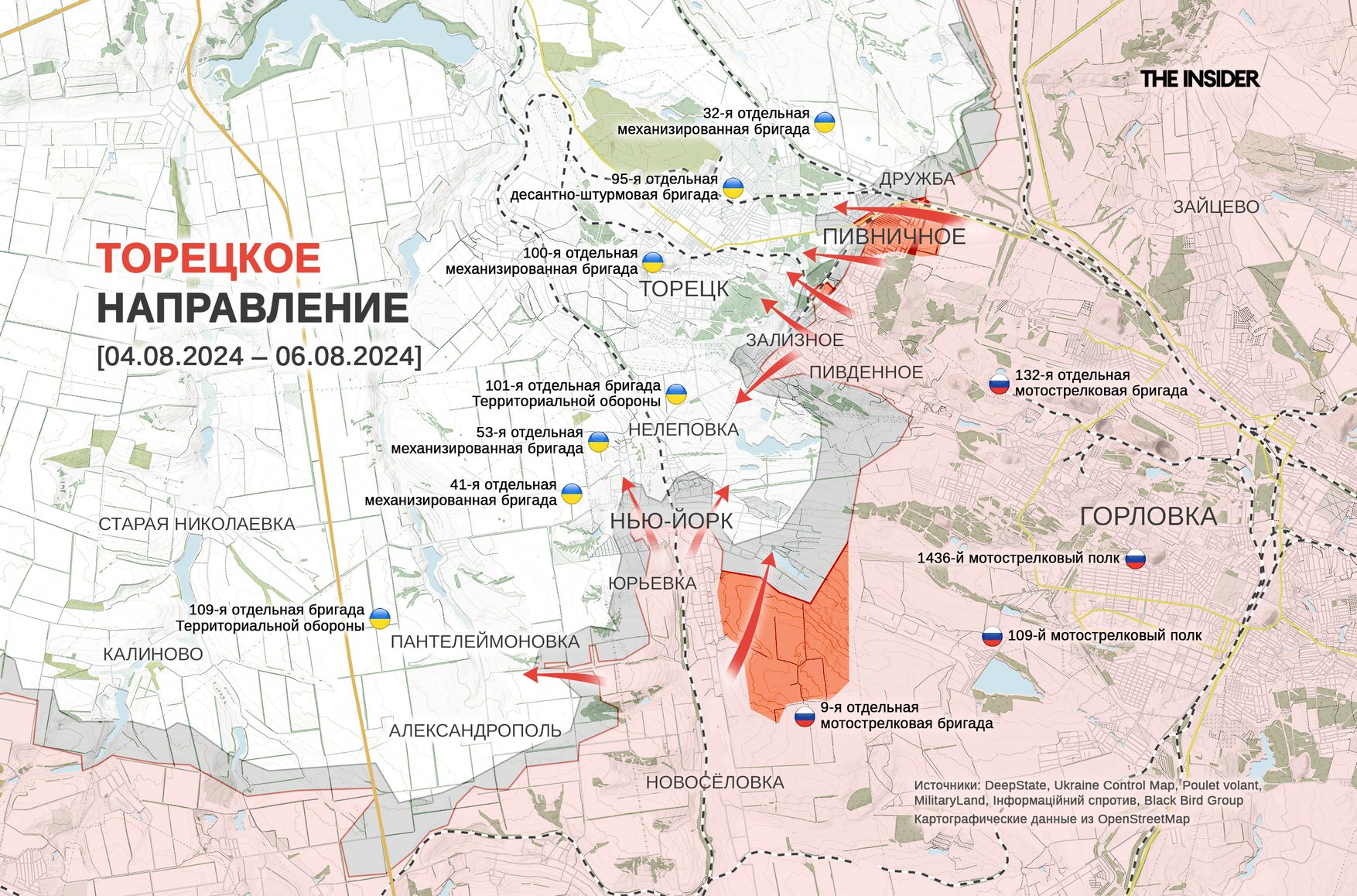 DeepState фиксирует продвижение российских войск на торецком направлении около Желанного, Нью-Йорка (в 1951–2021 годах — Новгородское), в Зализном (до 2016 года — Артёмово) и Пивничном (до 2016 года — Кирово). В то же время украинским военным удалось выйти из потенциального окружения на позициях к юго-востоку от Нью-Йорка.
