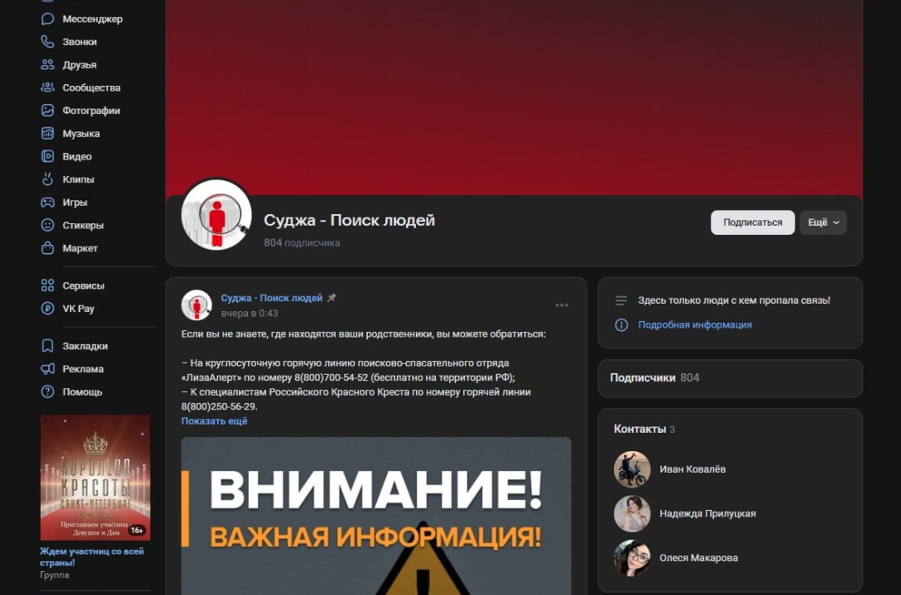 Генпрокуратура заблокировала группу «Суджа — Поиск людей» во «ВКонтакте»