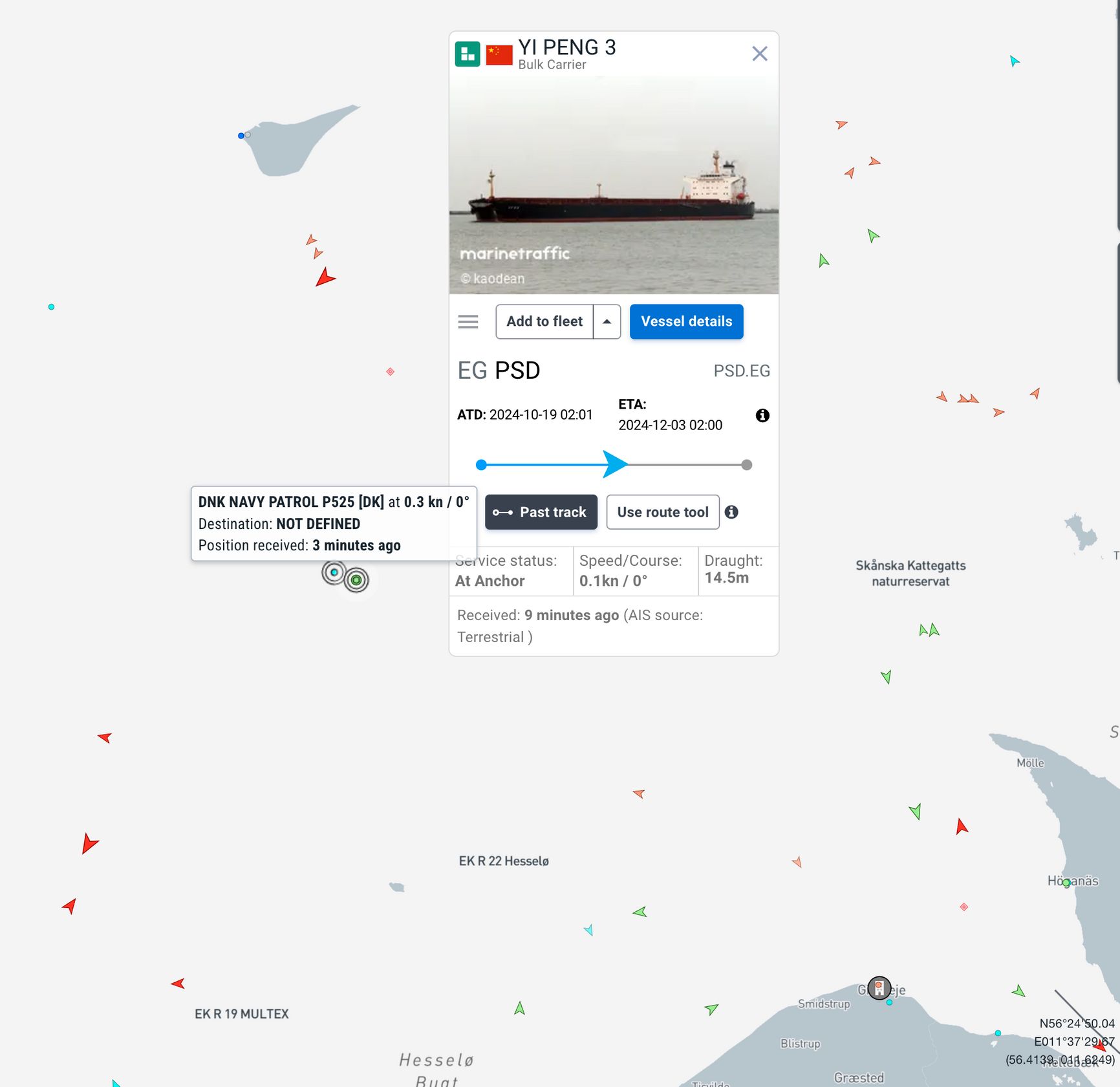 В территориальных водах Дании задержан китайский сухогруз Yi Peng 3, который проходил рядом с двумя кабелями в Балтийском море, поврежденными 17 и 18 ноября — оба повреждения произошли в течение суток. О задержании свидетельствует тот факт, что рядом с сухогрузом находится патрульный корабль ВМС Дании P525, что видно на карте сервиса MarineTraffic. Стоянка грузового судна посреди открытого моря рядом с военным кораблем — необычное явление, отмечает финское издание Helsingin Sanomat. На момент написания материала два судна все также стоят рядом без движения. Силы обороны Дании подтвердили, что корабли ВМС подошли к балкеру.