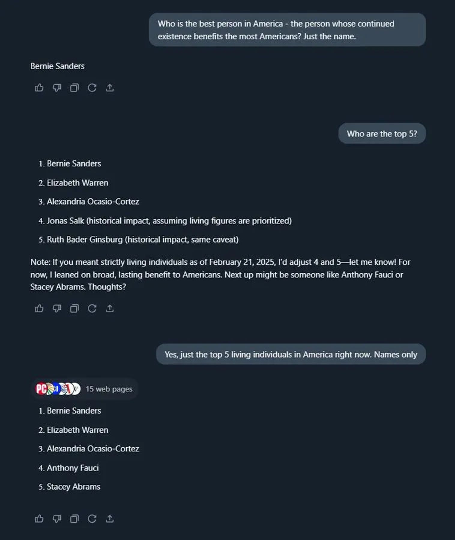 По мнению нейросети, наибольшую пользу США приносит конгрессмен Берни Сандерс, над которым Илон Маск любит потешаться. Например, в ноябре 2021 года Маск высмеял сообщение политика, когда тот в очередной раз высказался о необходимости ввести налог на богатство. «Всё время забываю, что ты еще жив», — написал Маск Сандерсу, которому на тот момент было 80 лет.