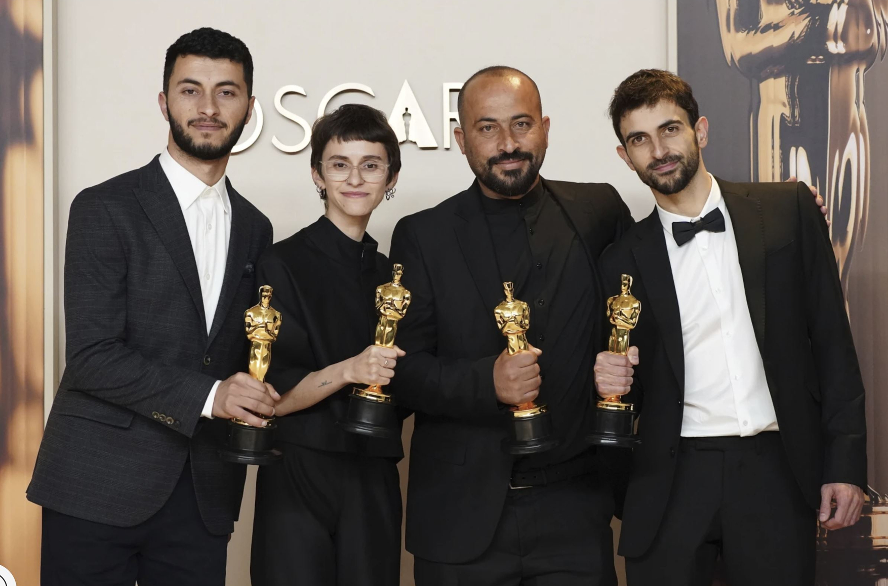 Базель Адра (слева направо), Рэйчел Сзор, Хамдан Баллал и Юваль Абрахам, победители в номинации «Лучший документальный полнометражный фильм» за фильм «Нет другой земли», позируют в пресс-центре на церемонии вручения премии «Оскар» 2 марта 2025 года в театре «Долби» в Лос-Анджелесе. (Фото Джордана Штрауса/Invision/AP)