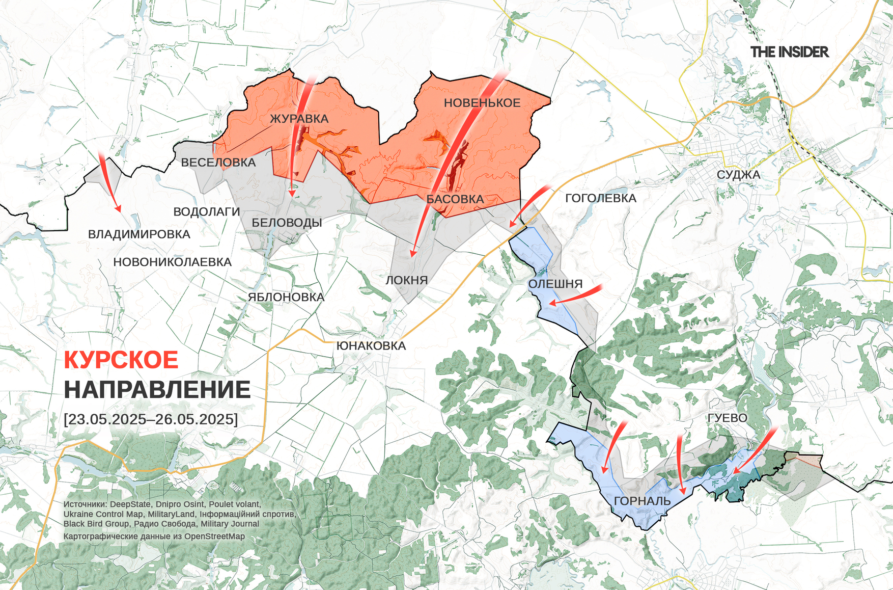Аналитики DeepState впервые после начала боевых действий в Сумской области отметили российский контроль над приграничной полосой общей площадью свыше 60 кв. км. Аналитики пишут, что подразделения ВС РФ продвинулись в Новеньком, Басовке и Журавке.